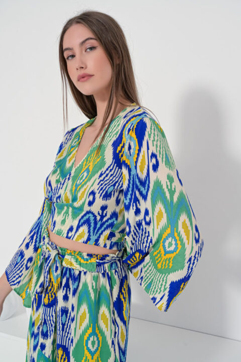 Κρουαζε τοπ μπλε ικατ με καμπάνα μανίκι