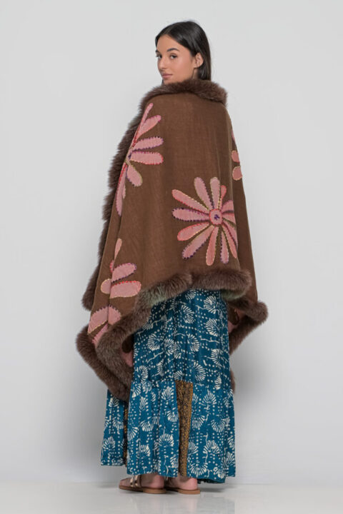 Boiled Wool shawl with handmade embroidery and fur