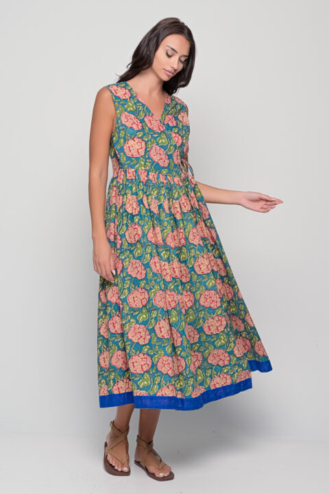 Sufi Teal Floral Cotton Dress – Handmade Block Print (Free Size up to XL)