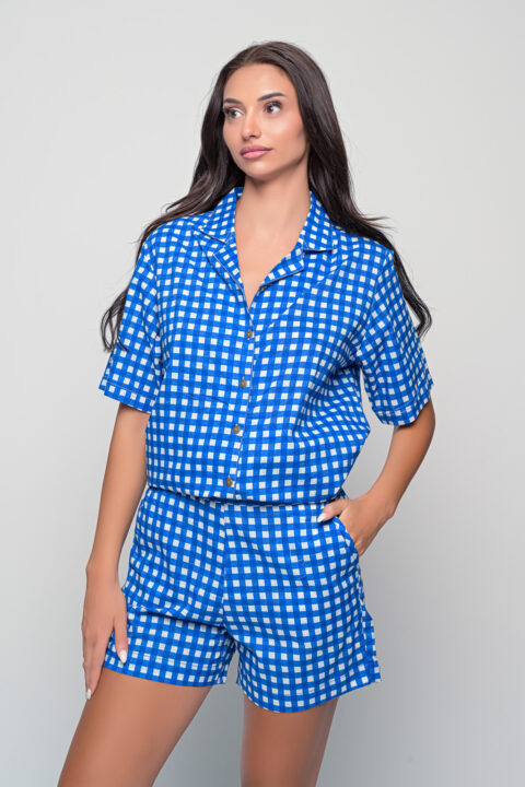 Women’s Blue Checked Two-Piece Set – Button-Up Shirt & High-Waist Shorts