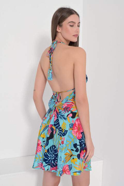 0784 Open back blue short dress with parots