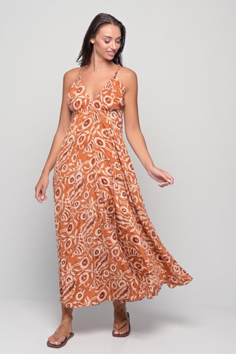 Open Back Long Dress – Flame Beige Digital Print, Saree Silk, One Size