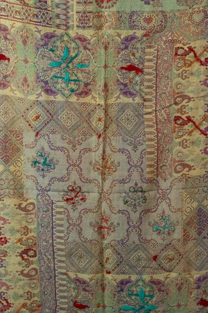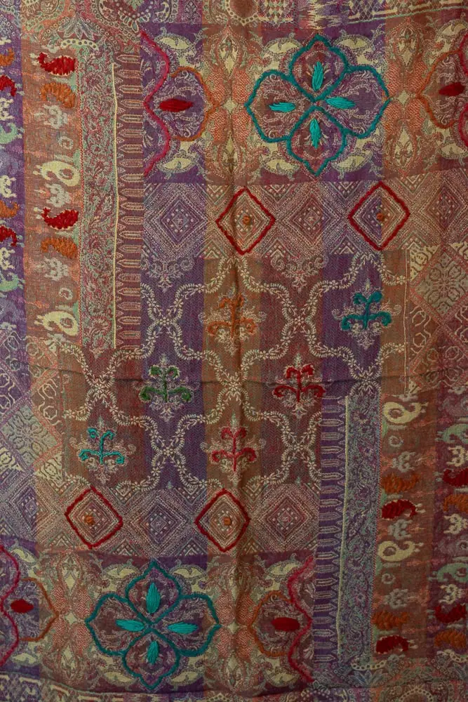 Η ζεστή καφέ βάση διακοσμείται με πολύχρωμα λουλούδια και γεωμετρικά μοτίβα, κεντημένα στο χέρι, δημιουργώντας ένα πραγματικά ξεχωριστό κομμάτι. Κάθε εσάρπα είναι μοναδική και φτιαγμένη με υπομονή και μεράκι.