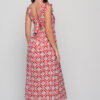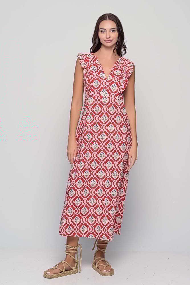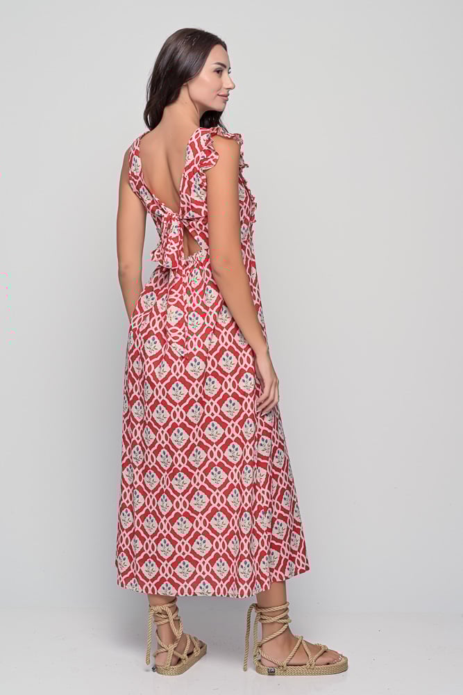 The Acacia Dress in Red Triangular Print — a sleeveless cotton midi dress with ruffled shoulders and open back ties. Available in SM and ML.