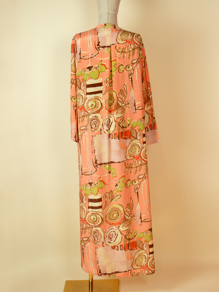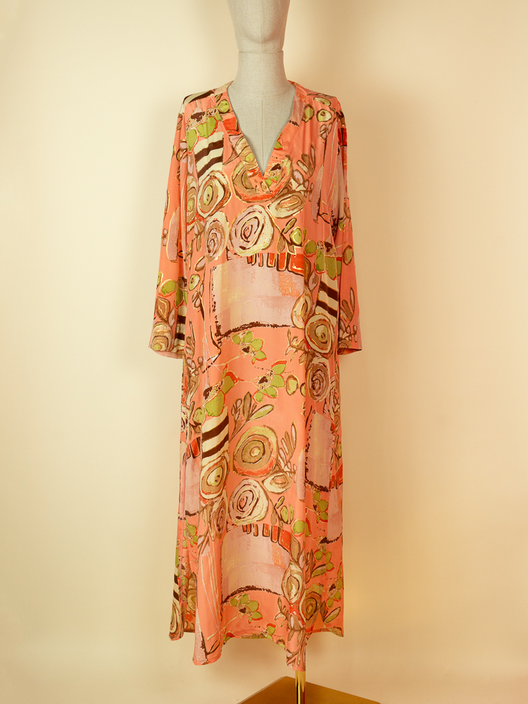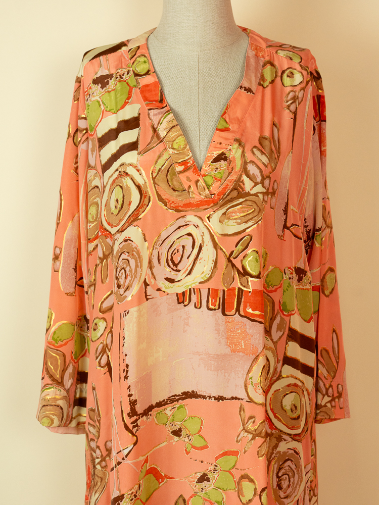 Featuring a vibrant coral base with an abstract rose-inspired print, it brings together color, movement, and a modern bohemian spirit. The relaxed silhouette, V-neckline, and fluid drape create a flattering shape that suits many body types.