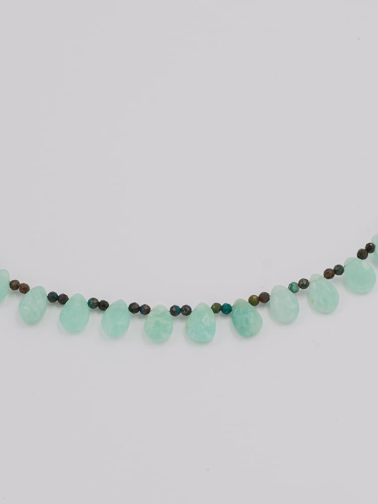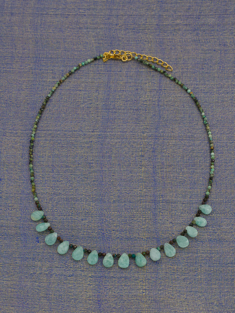 A delicate and refined necklace featuring faceted Amazonite drop stones combined with fine semiprecious beads and high-quality gold plated brass details.