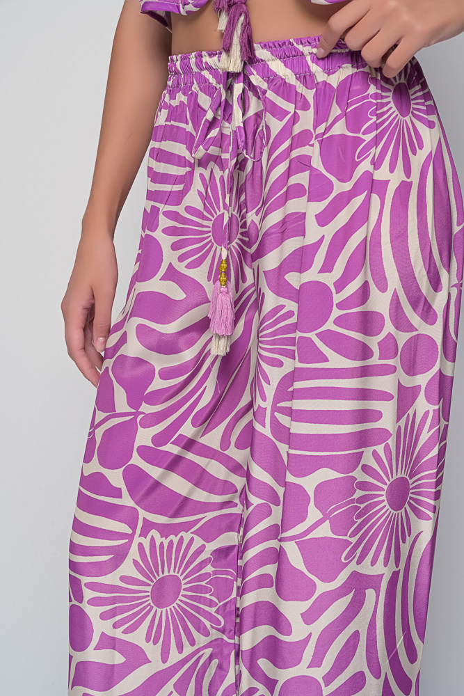 Featuring an elasticated waist with adjustable drawstring and wide legs for a relaxed fit, these trousers balance ease with refined style. The Margaret Purple Print combines soft yellows, orange, and coral tones in a joyful pattern that brightens any look.