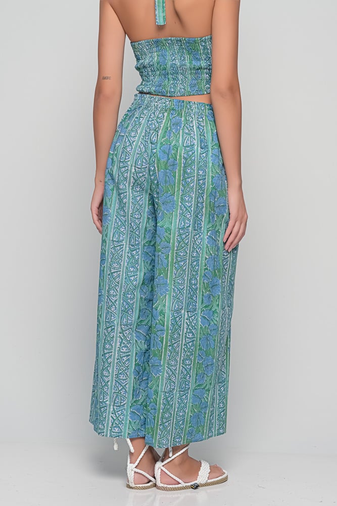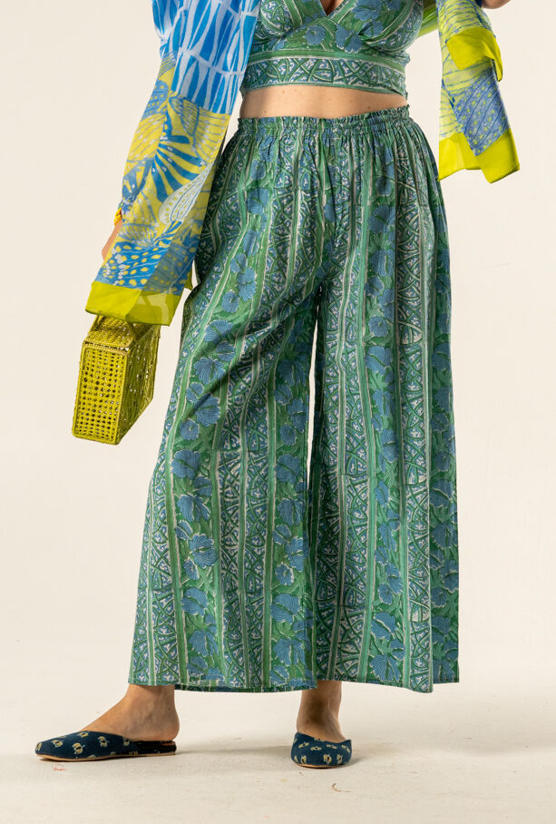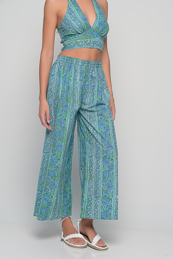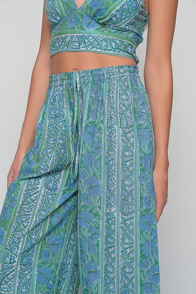 The Anna Trousers in blue green block print celebrate craftsmanship and timeless bohemian style. Pair them with a simple blouse or the matching top for a coordinated look.