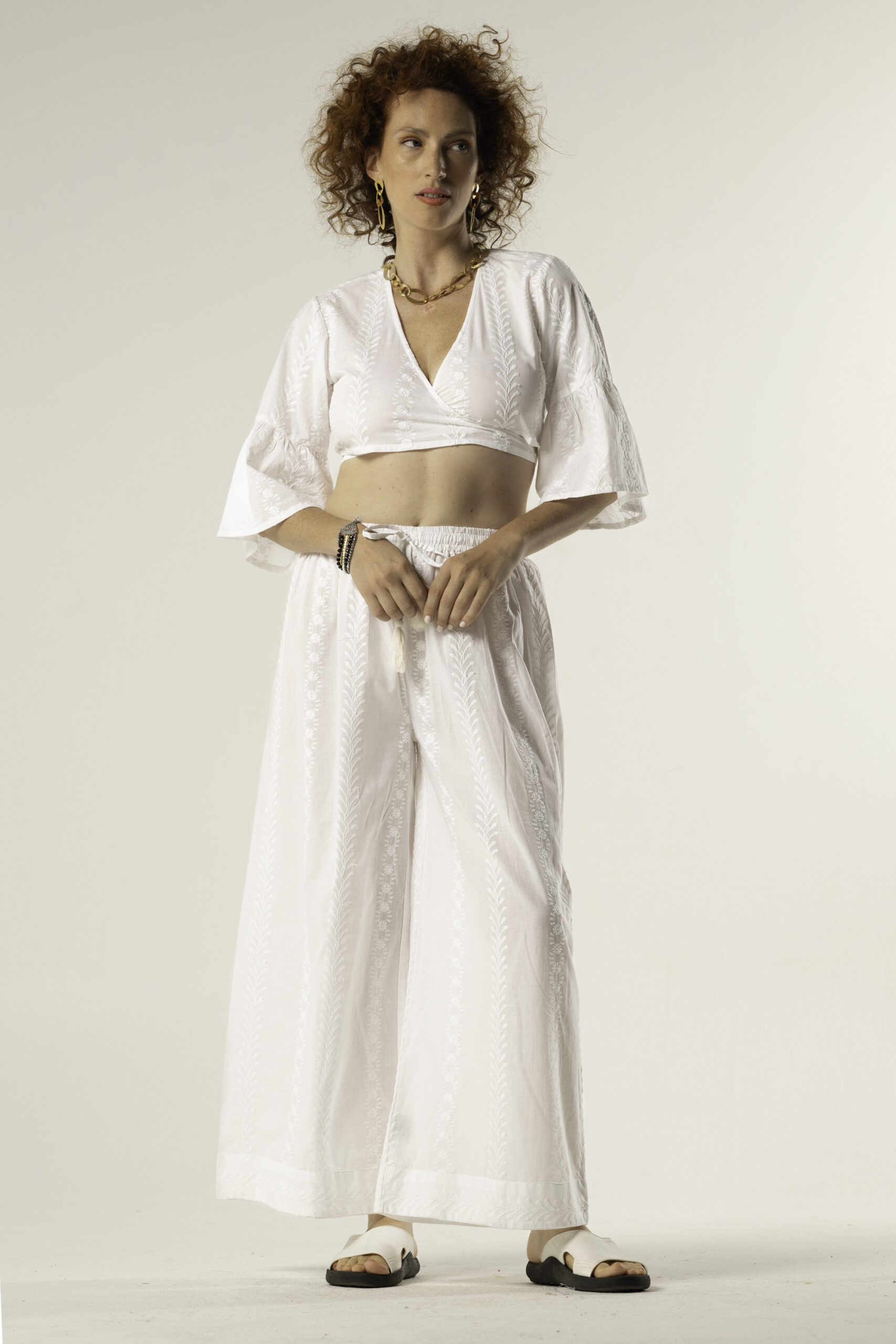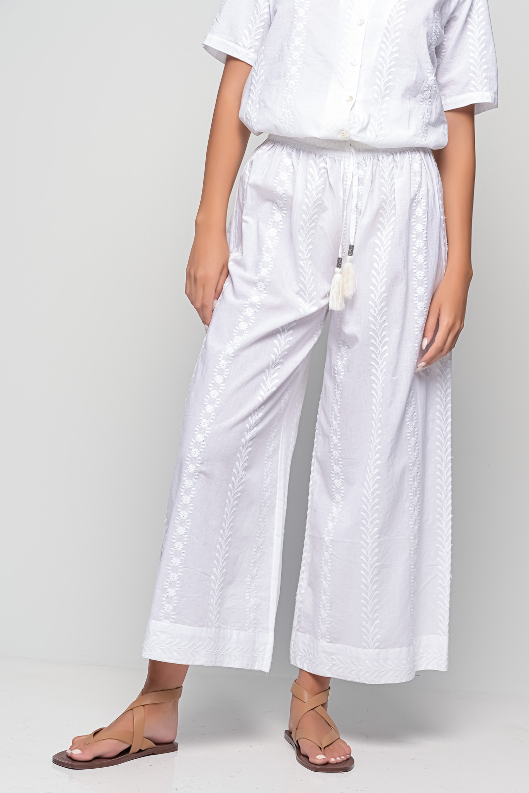 The Anna Wide-Leg Trousers in white cotton with delicate embroidery are a summer essential that combine relaxed comfort with effortless elegance. Made from 100% breathable cotton, these trousers are designed for easy movement and a soft, airy feel on the skin.