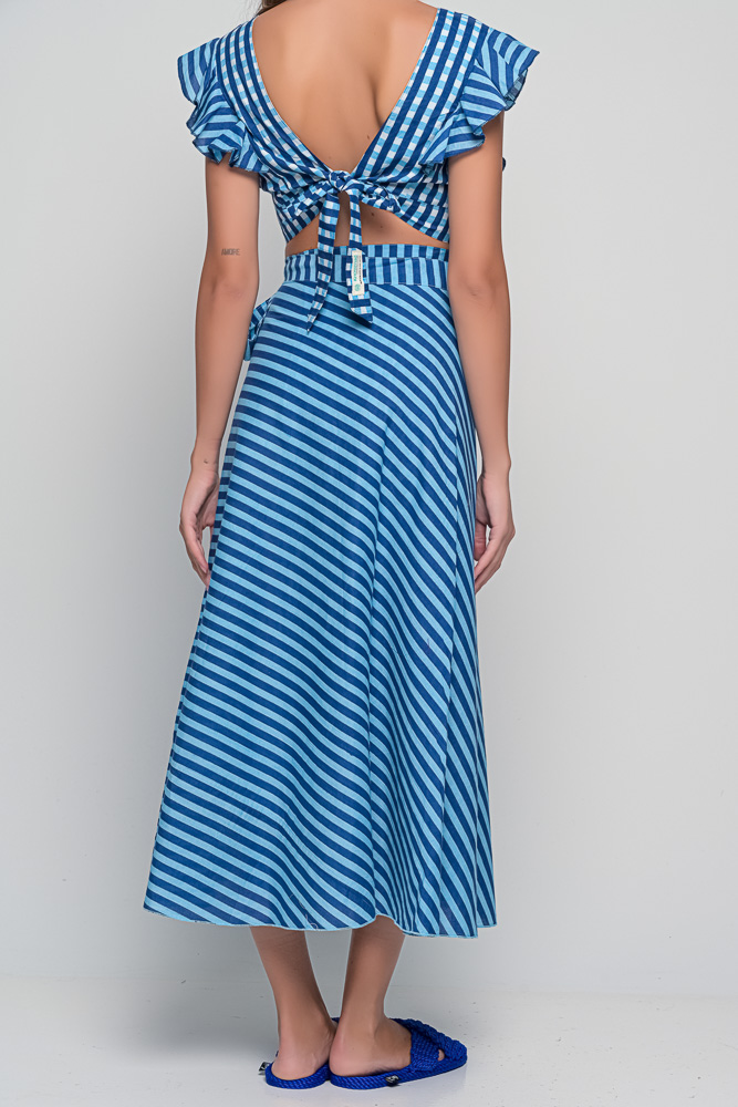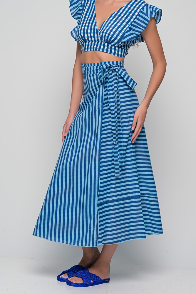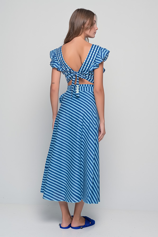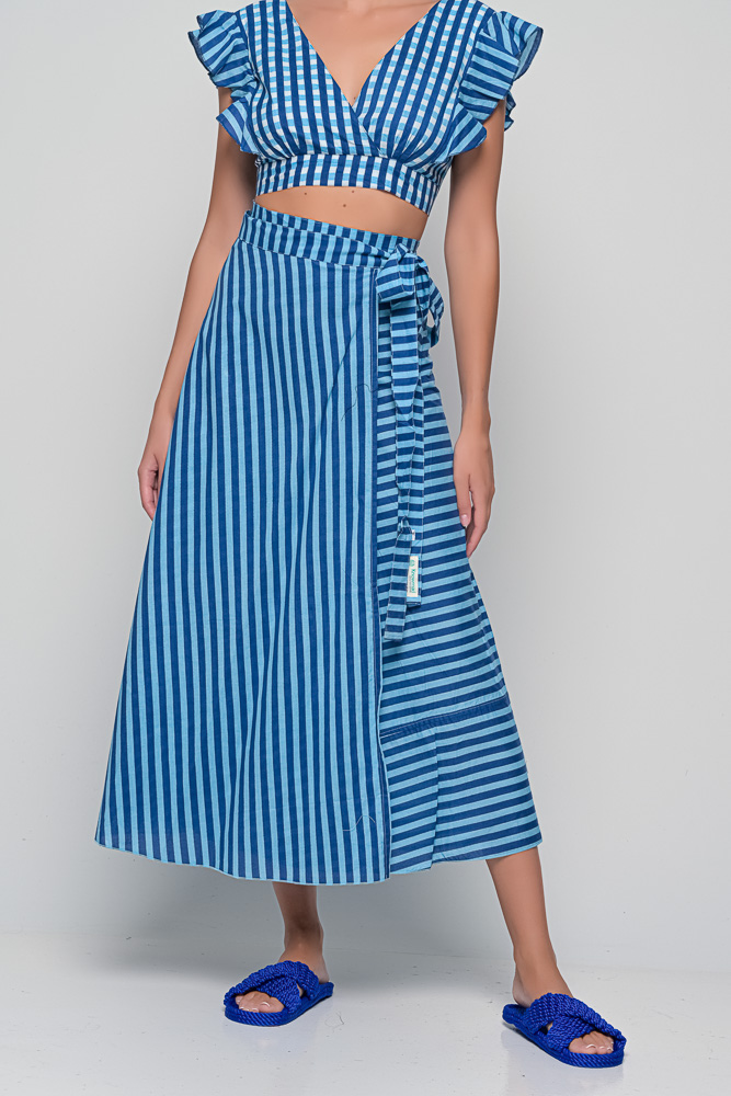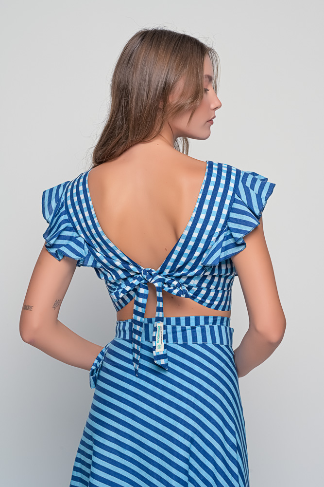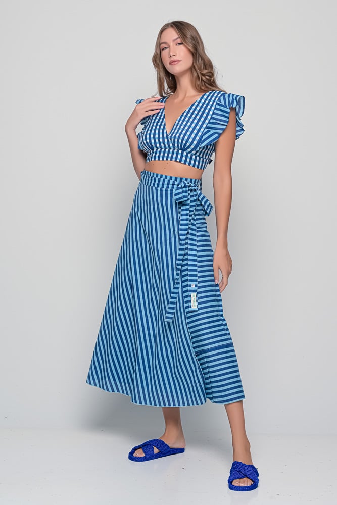 The Anokhi Set is a playful yet elegant Knowmad design crafted in breathable cotton. This version features the Stripes print in blue, giving it a fresh and timeless appeal. The flutter-sleeve crop top with a deep V-neck pairs effortlessly with the wrap-style maxi skirt, making this two-piece set perfect for summer days, vacations, or evenings out. Both pieces can be styled together or separately, offering versatile wardrobe options.