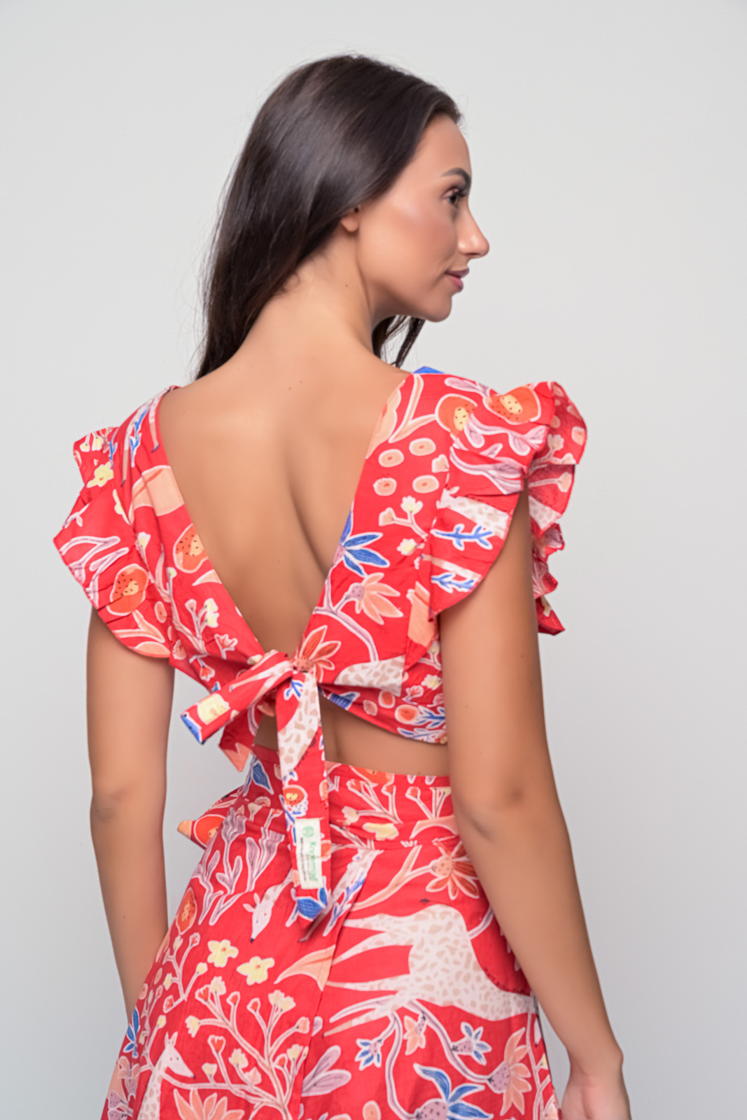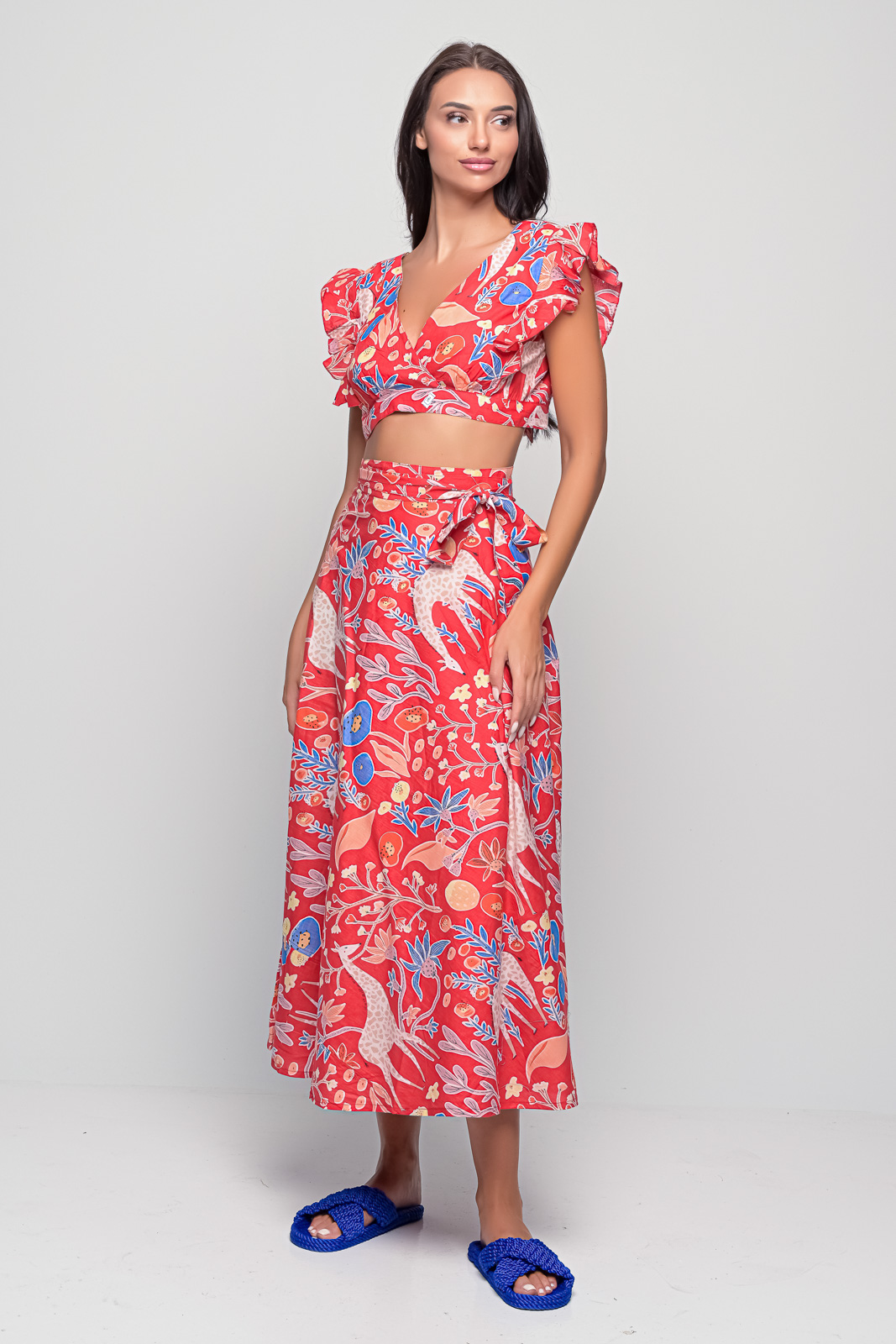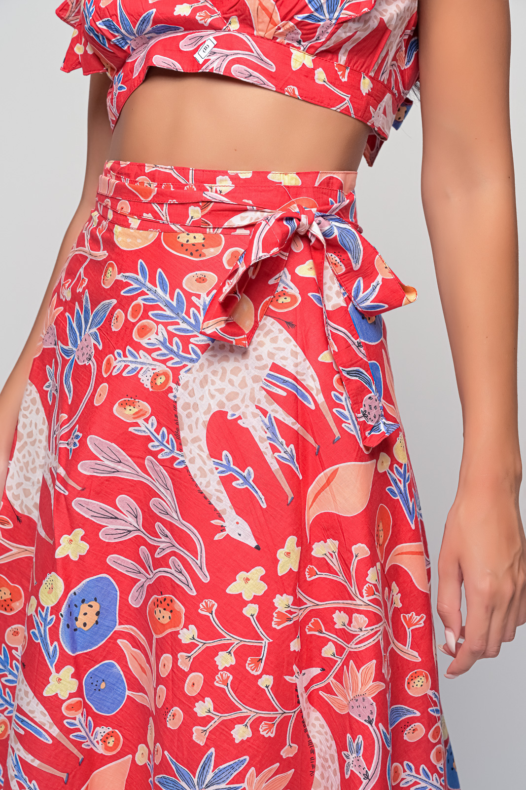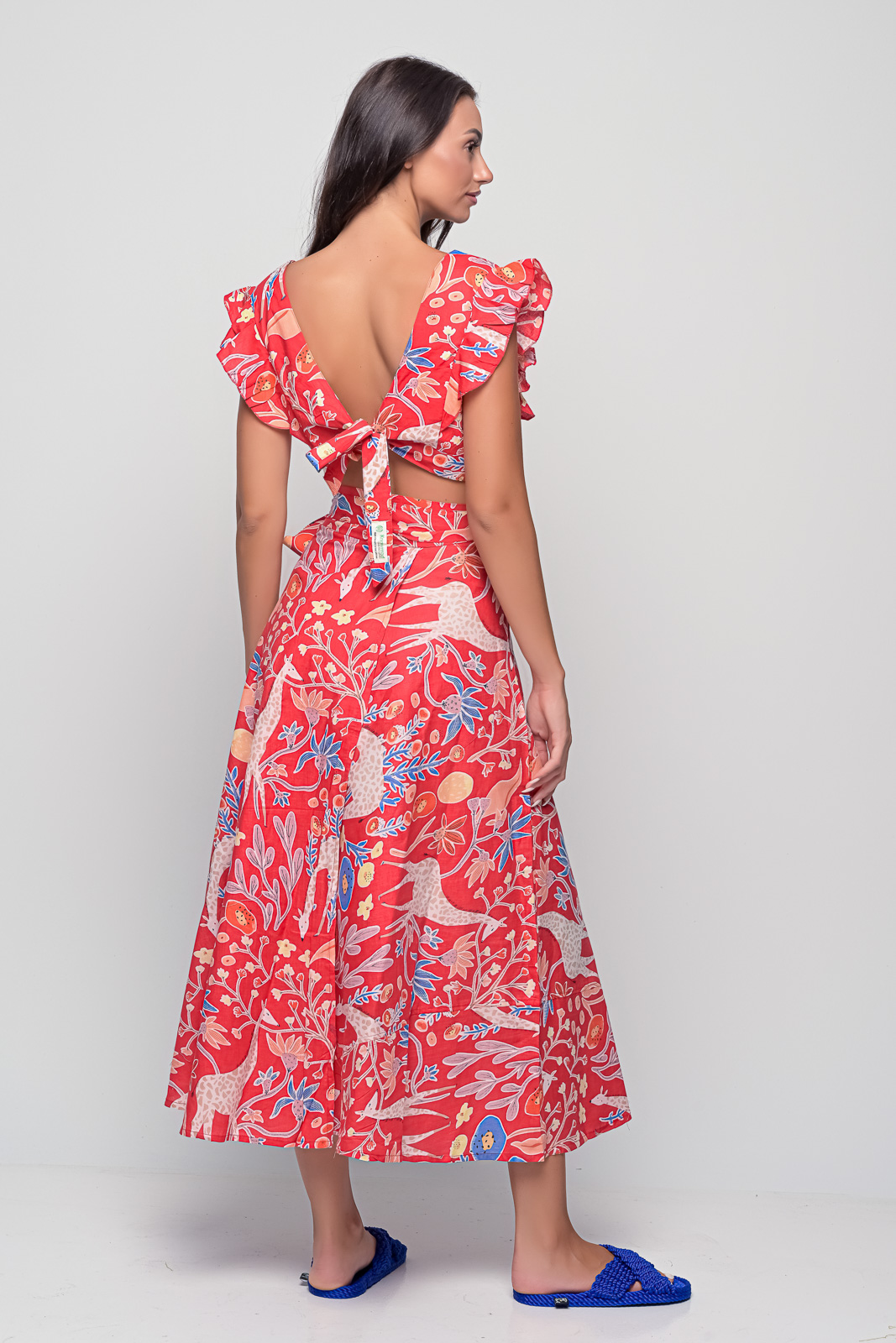 An elegant long wrap skirt-free size and back tie top 2 pcs set in red giraffe print that will make you invincible. Its soft cotton fabric flows from weave to weave encompassing you in a bohemian style, perfect for day and night.
