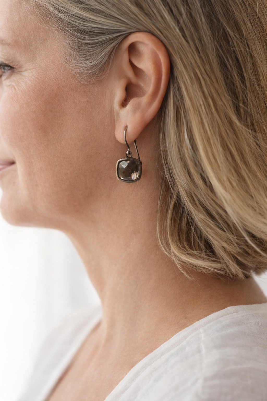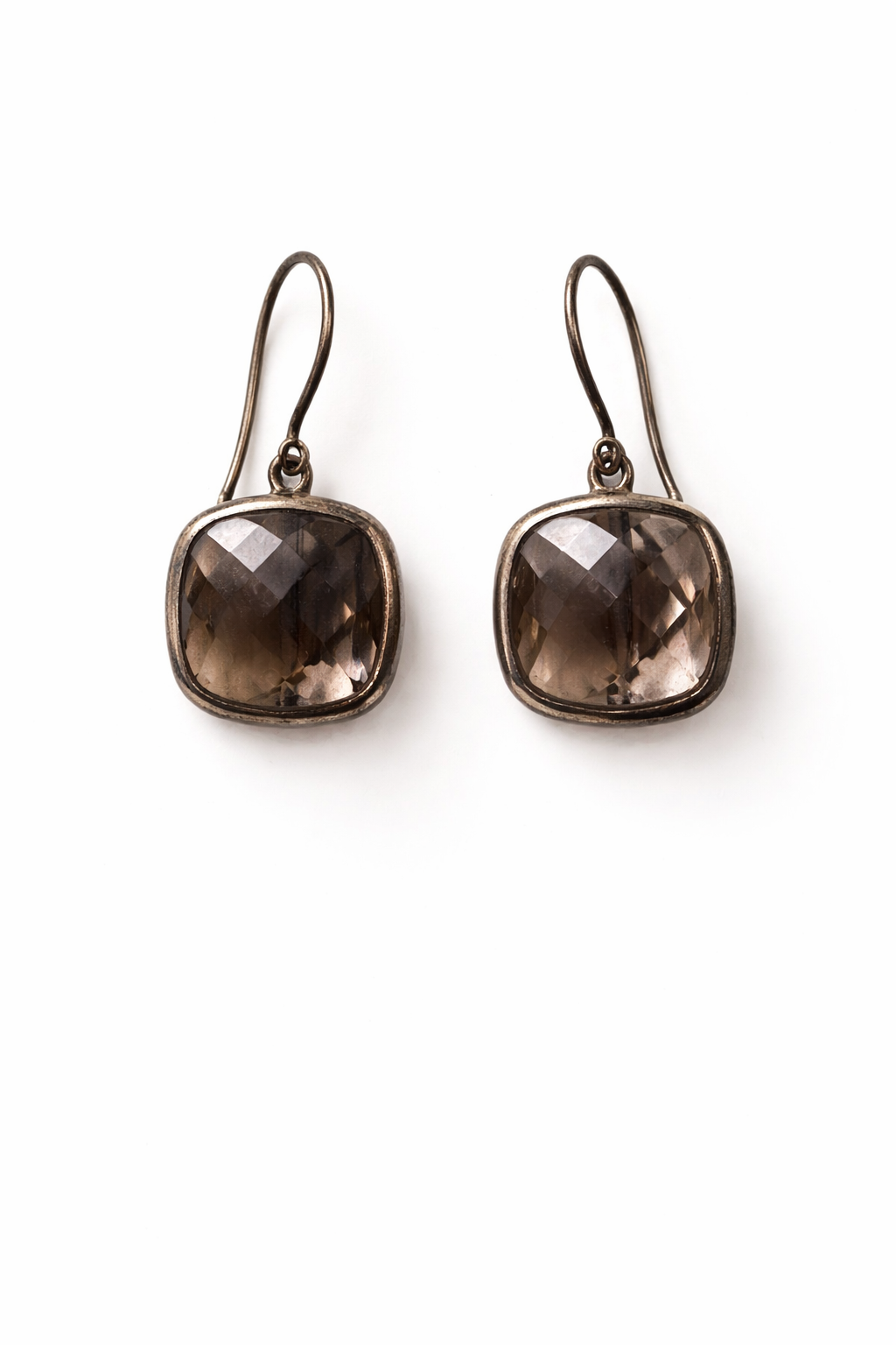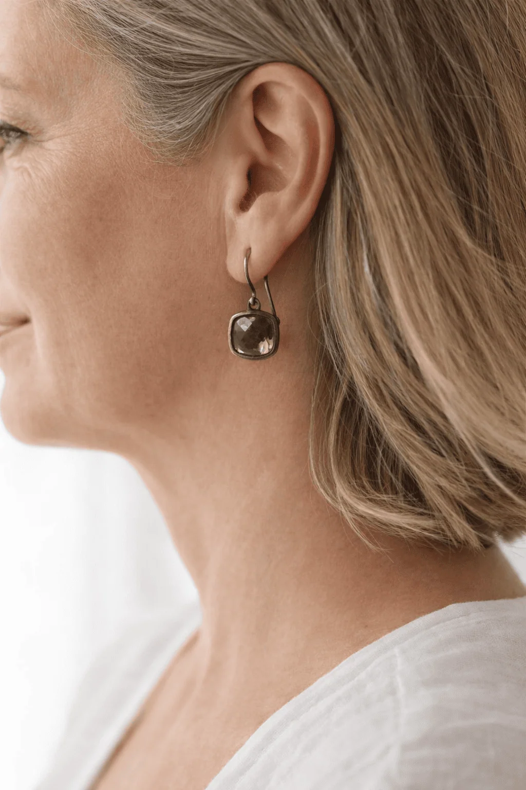 The faceted smoky quartz reflects light gently, creating subtle movement and a refined glow. Their compact drop shape makes them easy to wear throughout the day while still offering enough presence for evening styling.