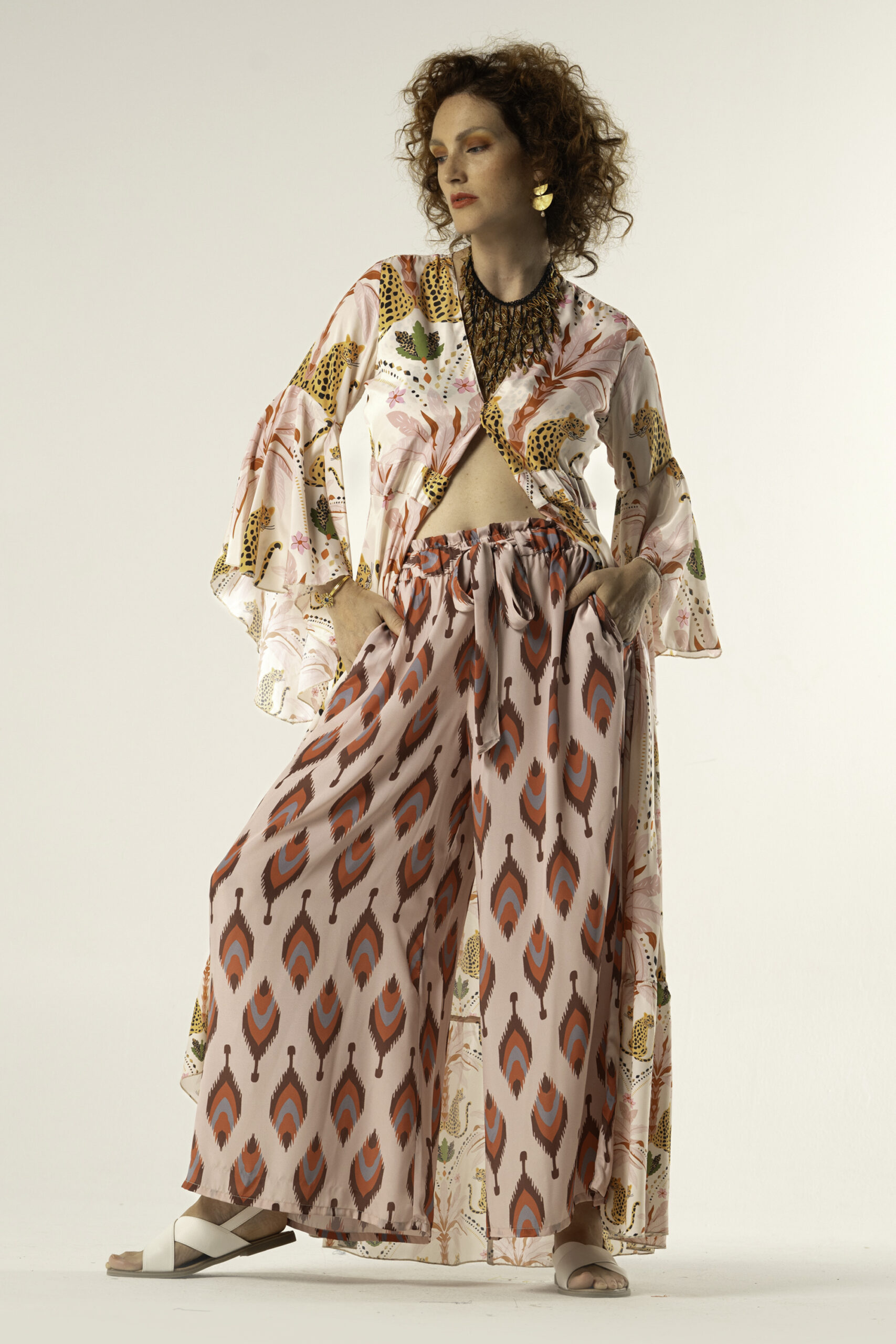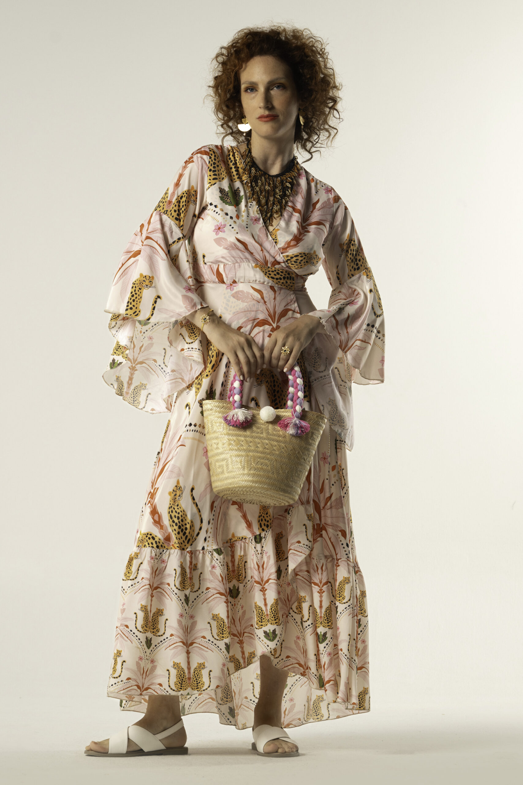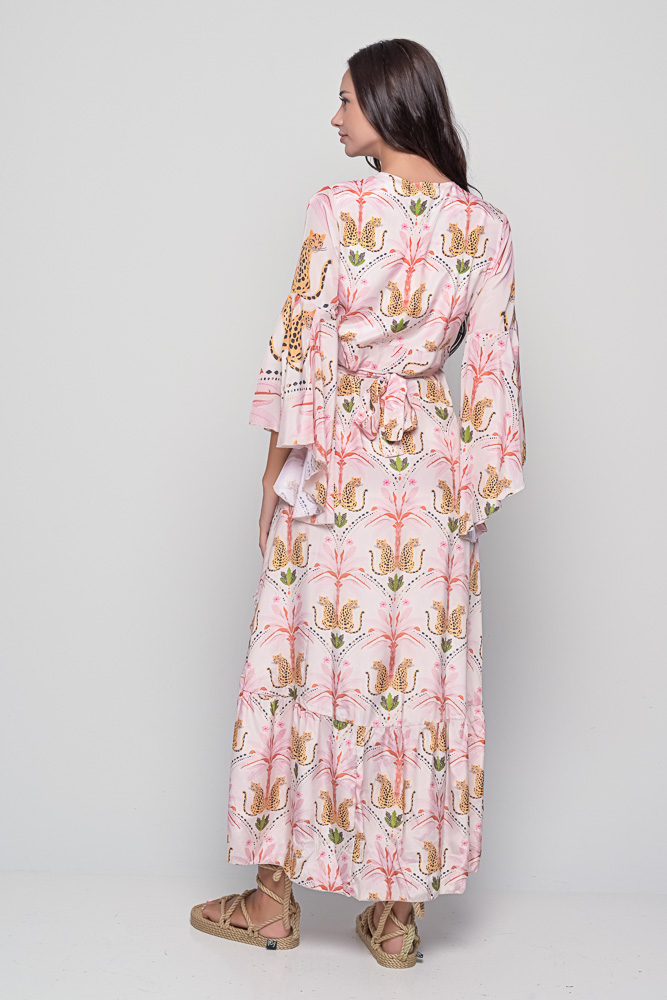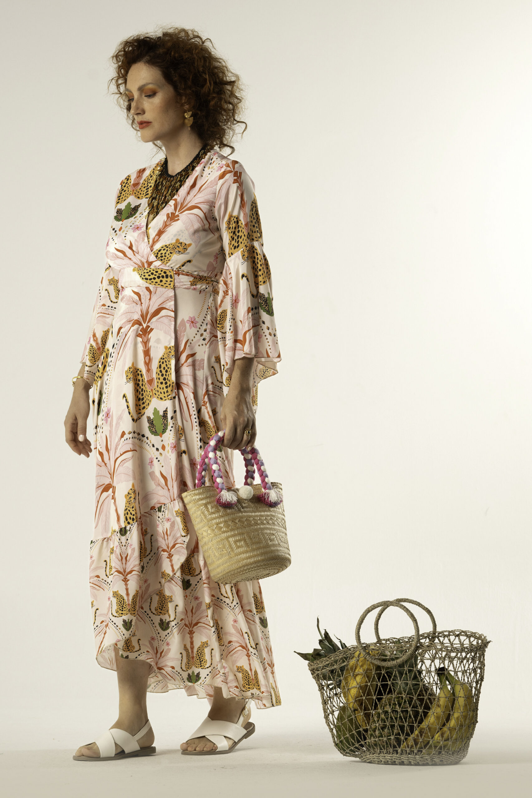 The Aphrodite Dress in Tiger Print is a beautiful expression of bohemian elegance and effortless comfort. Made from light, flowy saree silk, this dress features a digital tiger print that blends soft pink tones with nature-inspired patterns.