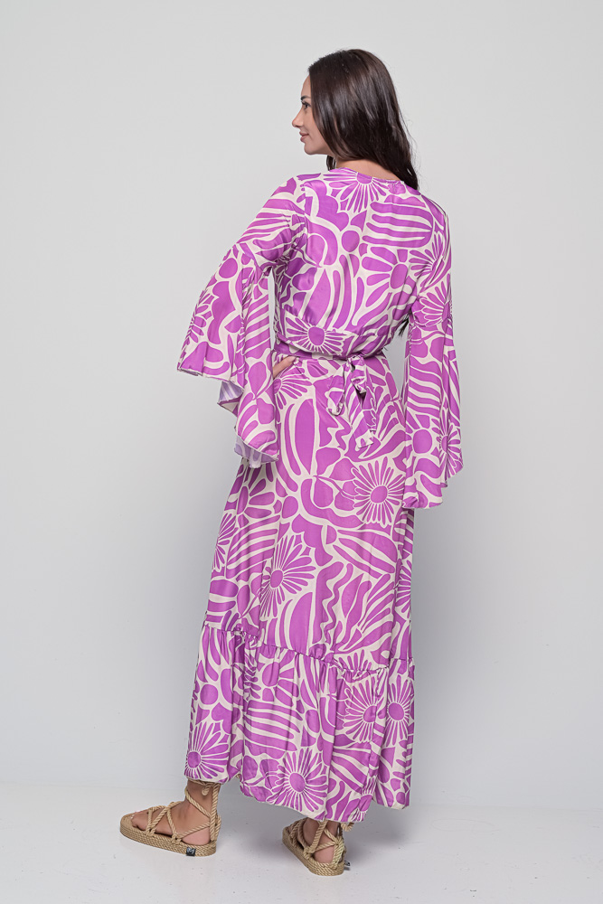 One of Knowmad’s signature silhouettes, the Aphrodite features flared bell sleeves, an adjustable waist tie, and a tiered flowing skirt that enhances its timeless charm. The Margaret Purple Print, inspired by sunlight and Mediterranean florals, radiates warmth and confidence.