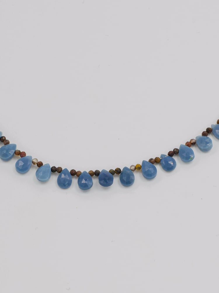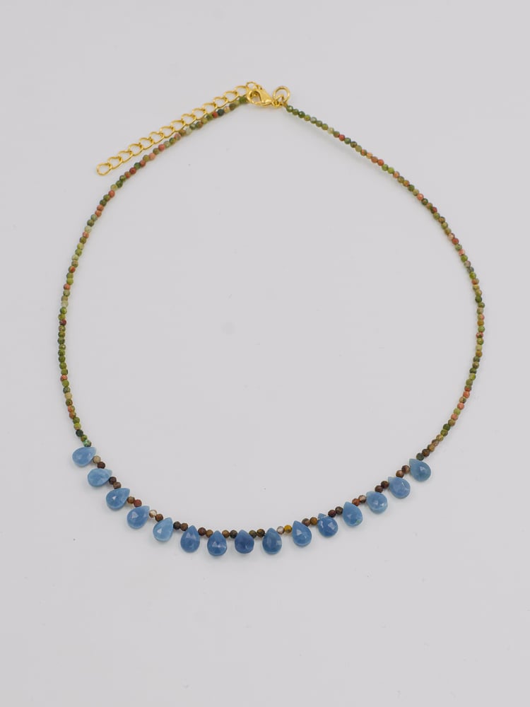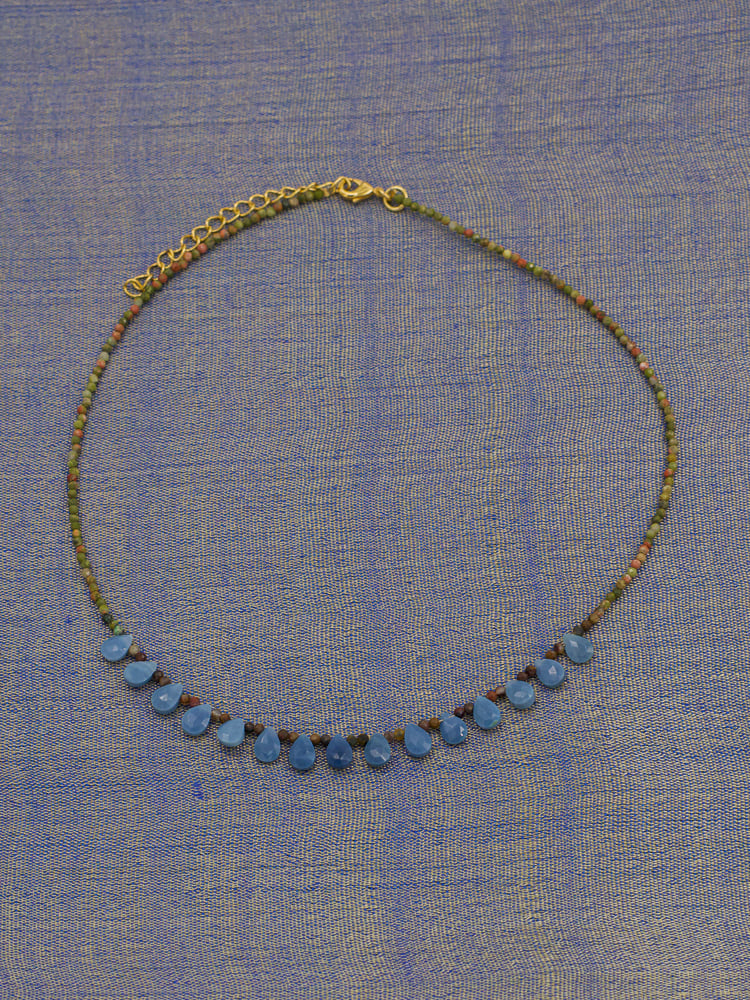 A delicate and refined necklace featuring faceted aqua chalcedony drop stones combined with fine semiprecious beads and high-quality gold plated brass details.