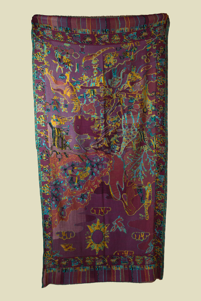 Made of soft natural wool, it features a vivid double-sided print inspired by mythology and nature — peacocks, elephants, flowers, suns, and birds come alive through saturated hues of turquoise, magenta, gold and teal.