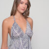 This one-size dress features a flattering halter neckline, open back, and adjustable ties adorned with tassel details. The Sueno Grey Print blends geometric motifs and gentle tones, creating a refined and versatile look that transitions easily from beach to evening wear.