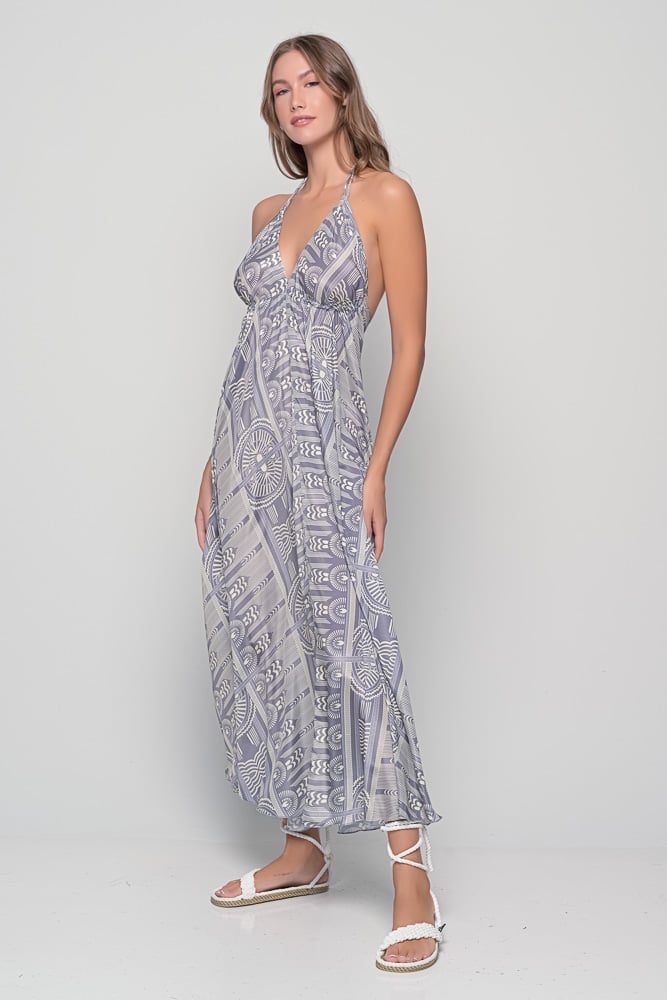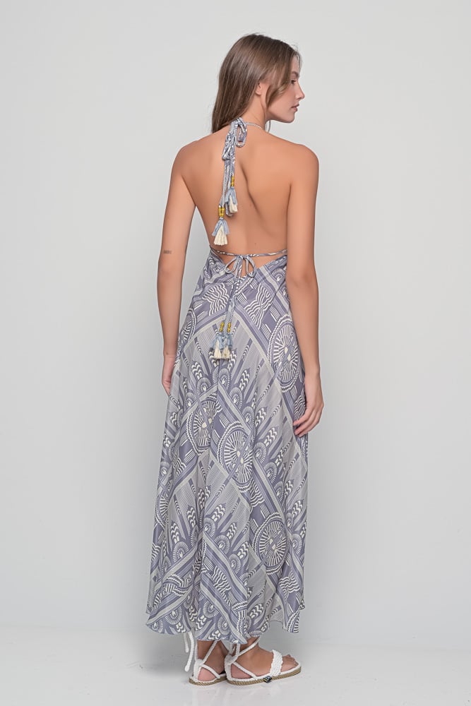 This one-size dress features a flattering halter neckline, open back, and adjustable ties adorned with tassel details. The Sueno Grey Print blends geometric motifs and gentle tones, creating a refined and versatile look that transitions easily from beach to evening wear.