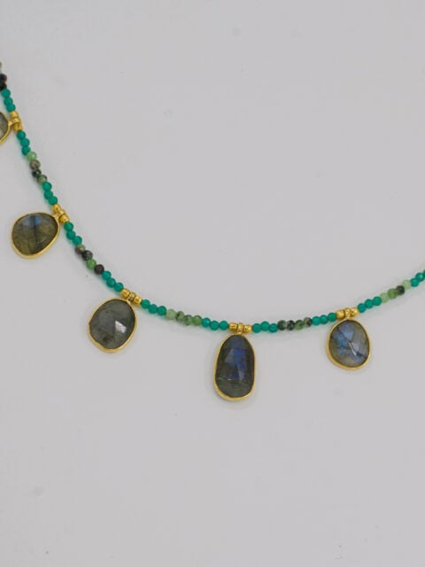 A delicate and refined necklace featuring faceted Blue Opal drop stones combined with fine semiprecious beads and high-quality gold plated brass details.