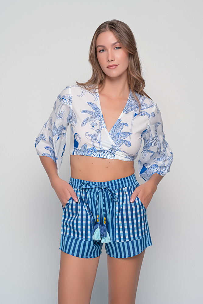 The Blue Palm & Stripe Cotton Set is the perfect balance of comfort, color, and carefree summer style. Crafted from soft, breathable 100% cotton, this two-piece set features a tropical palm-print crop top and matching striped shorts, creating a playful yet elegant look that’s ideal for warm, sunny days.