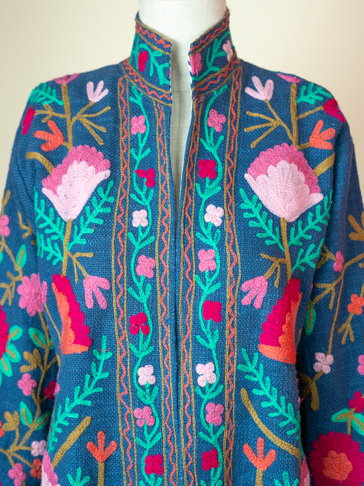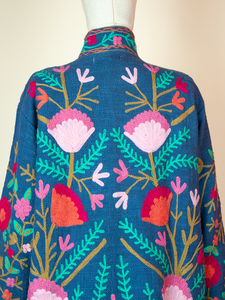 This kimono jacket is crafted from cotton TNT fabric and richly decorated with Suzani-style embroidery, celebrating traditional craftsmanship and vibrant color. The detailed embroidery features floral and symbolic motifs, creating a statement piece with strong character and artisanal appeal.