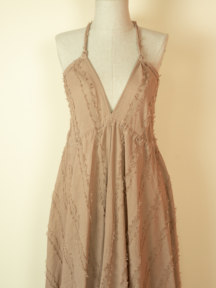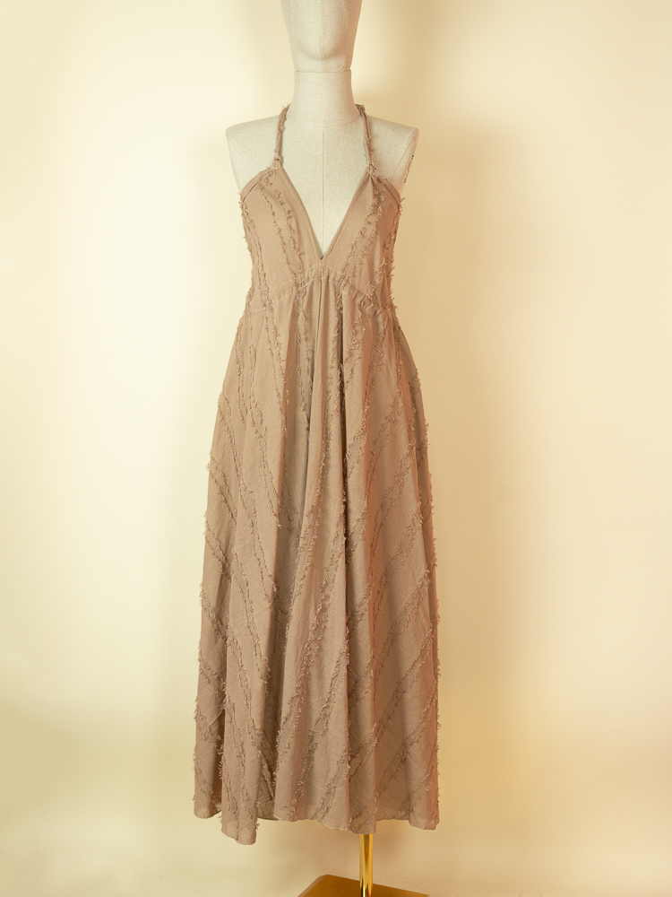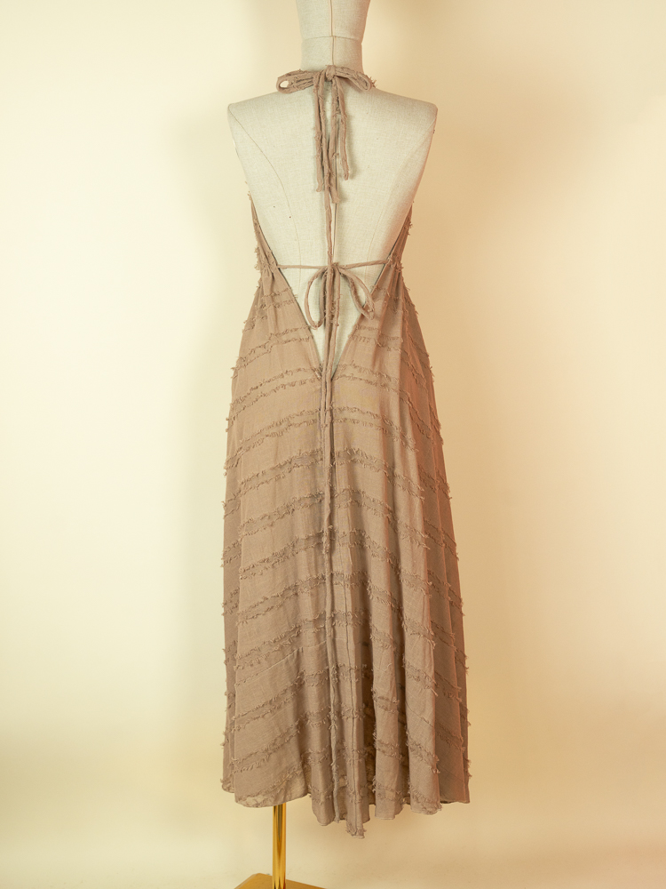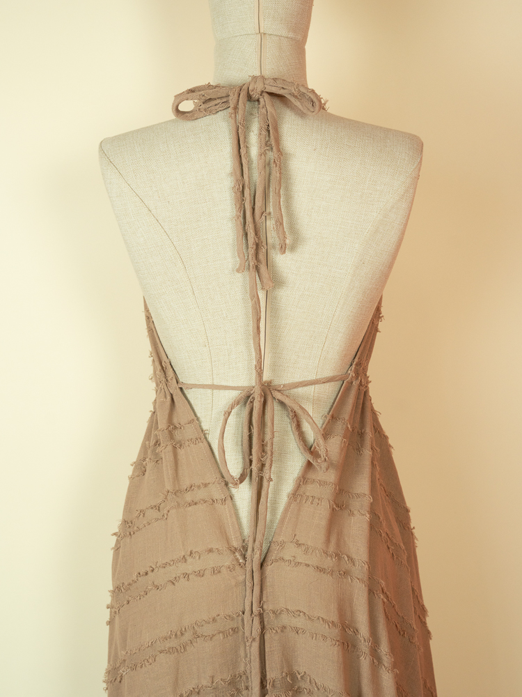 Crafted from textured cotton, it features a flattering halter neckline and a softly gathered bust that flows into a relaxed, airy shape. The open back with delicate tie details adds a sensual, refined touch while maintaining a natural, understated feel.