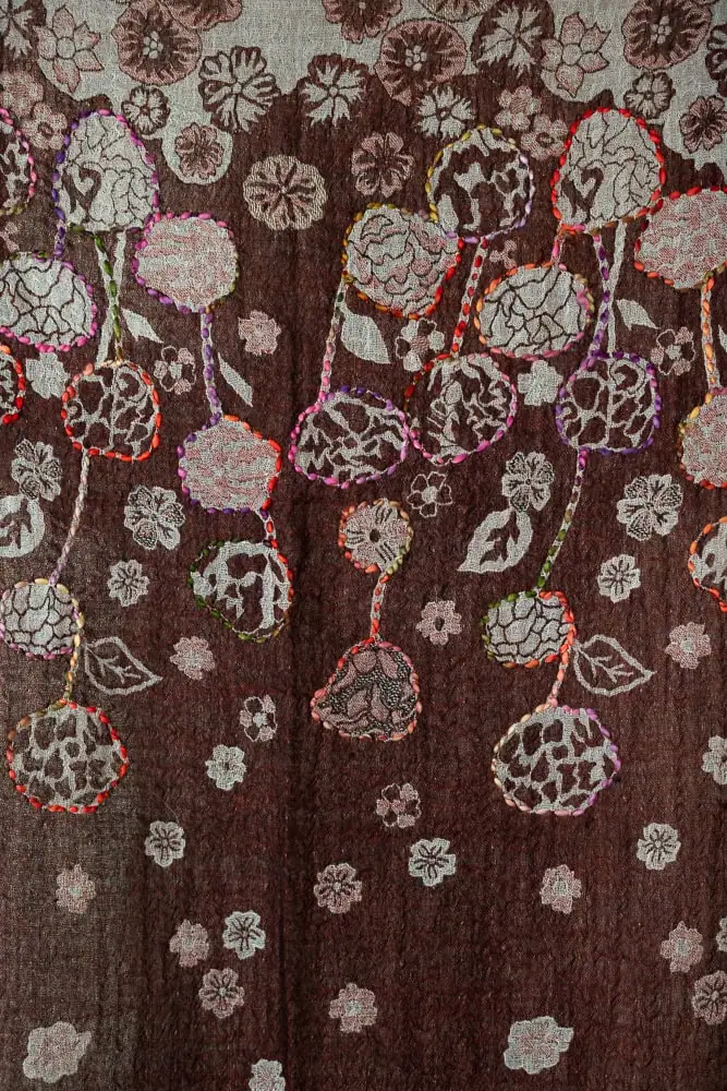 The rich brown base is adorned with colorful floral & geometric hand-stitching, each motif crafted one by one. Because the embroidery is handmade, each piece is unique, carrying its own personality and story.