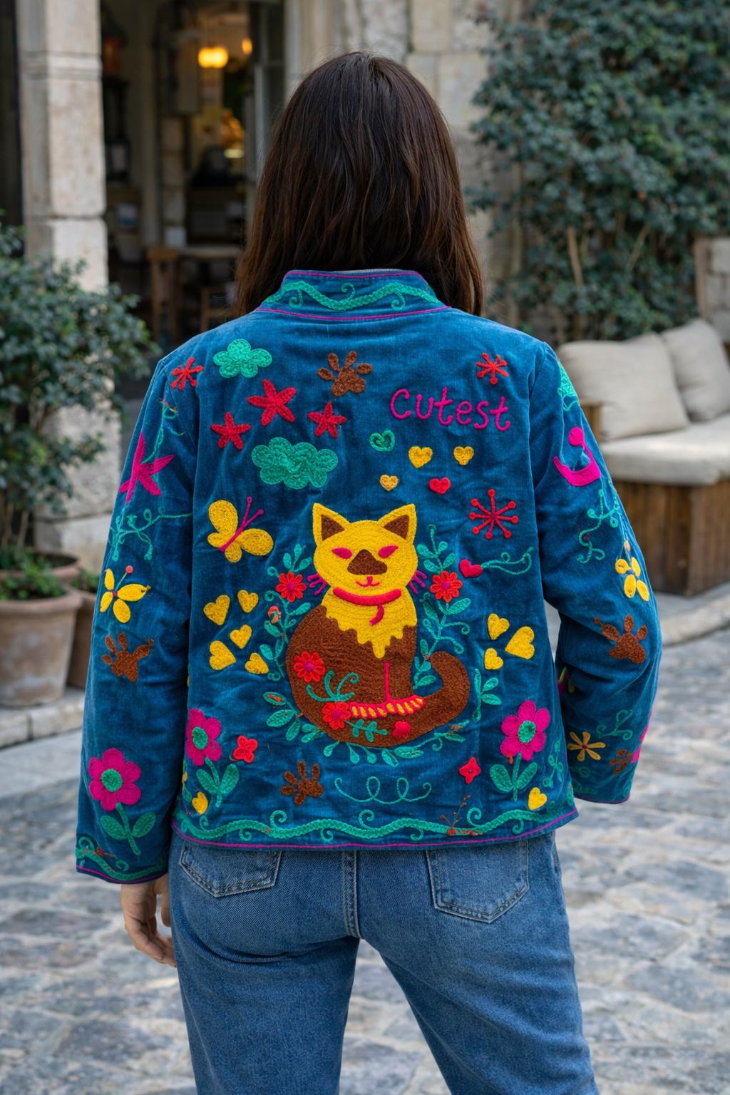 This cotton velvet jacket is a bold, artistic statement piece designed for women who express themselves through color and symbolism.