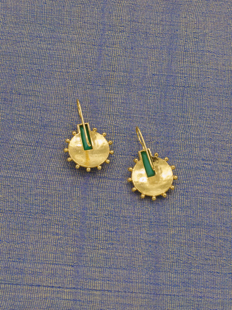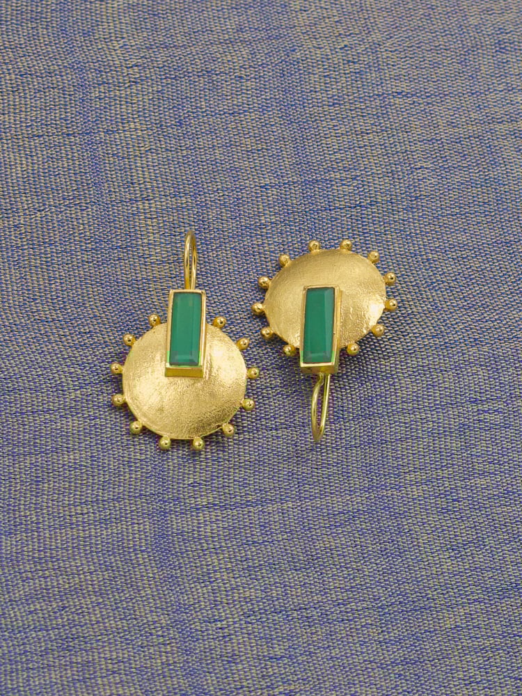 These green stone earrings are inspired by museum jewelry and ancient decorative forms, reinterpreted in a modern elegant way. Crafted from high quality gold plated brass, they feature chrysoprase onyx stones in a geometric vertical setting combined with a textured circular element reminiscent of ancient sun motifs.