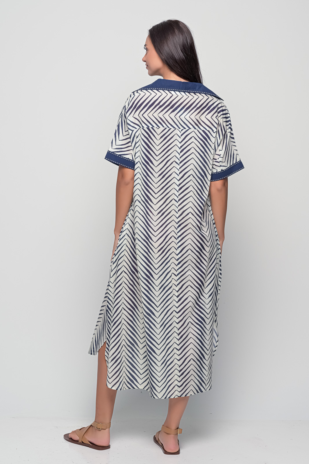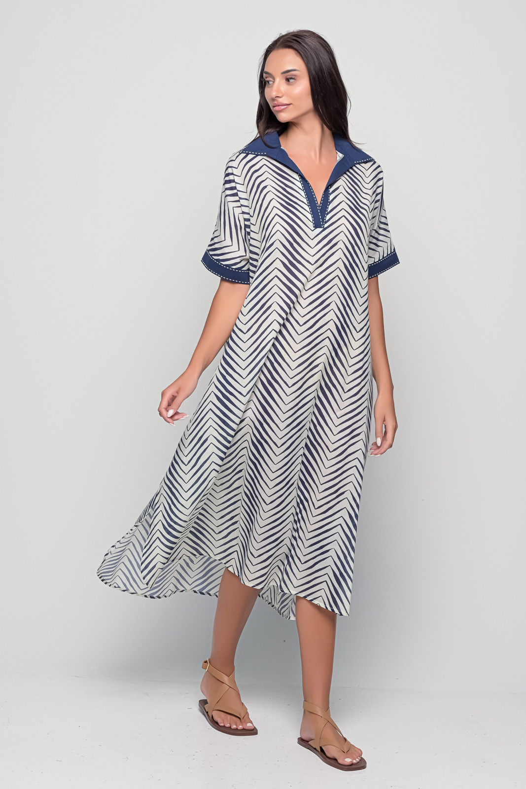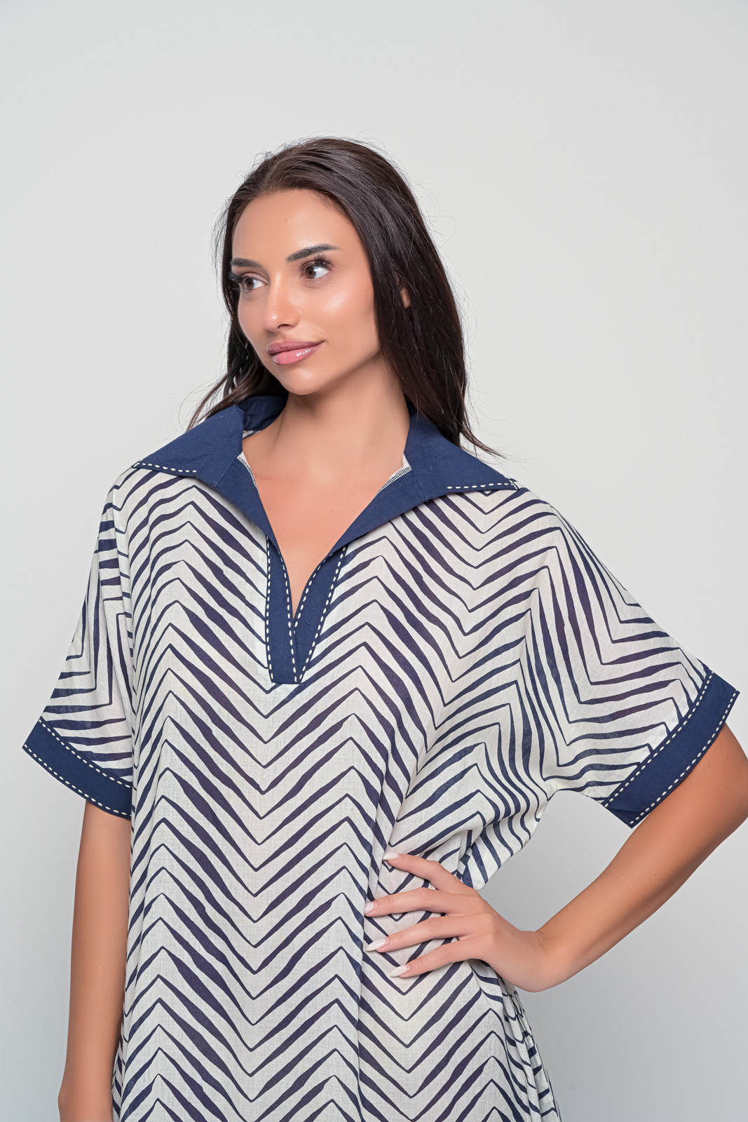 Bring timeless boho charm into your wardrobe with the Corfu Wave White Cotton Kaftan Dress. Made from 100% breathable cotton, it features a collared neckline, short sleeves, and a loose, flattering silhouette. The Wave print in white gives it a coastal freshness, perfect for seaside escapes and laid-back summer living.