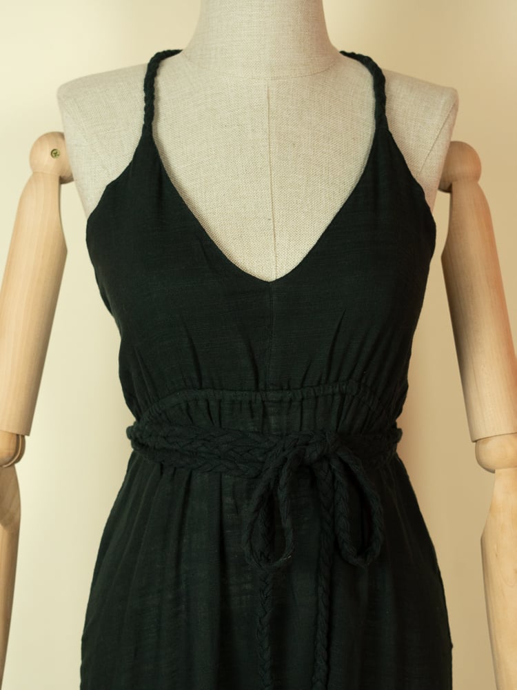 The halter neckline highlights the shoulders, while the adjustable braided waist tie allows you to define the shape as you wish. The side slits add movement and a subtle sensuality, making it perfect for warm summer days and sunset moments.