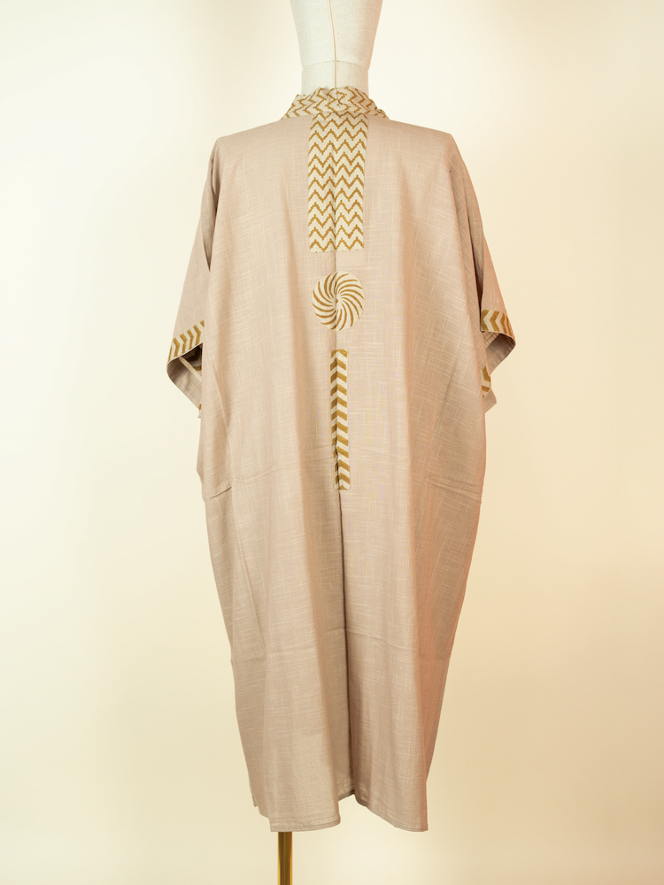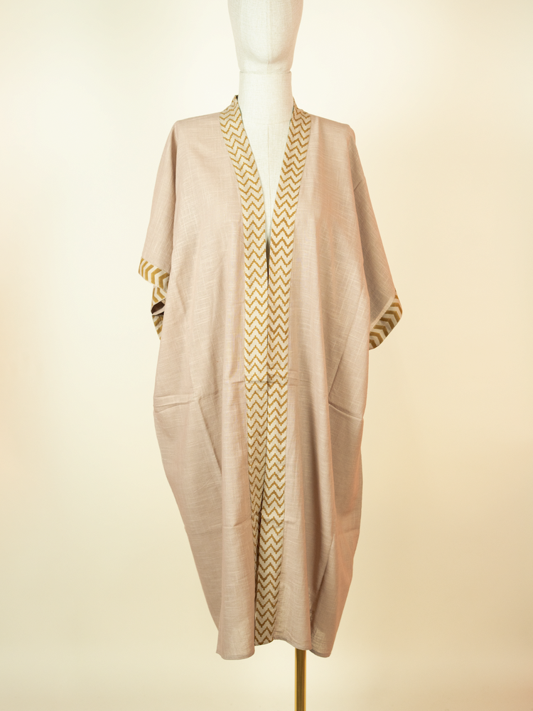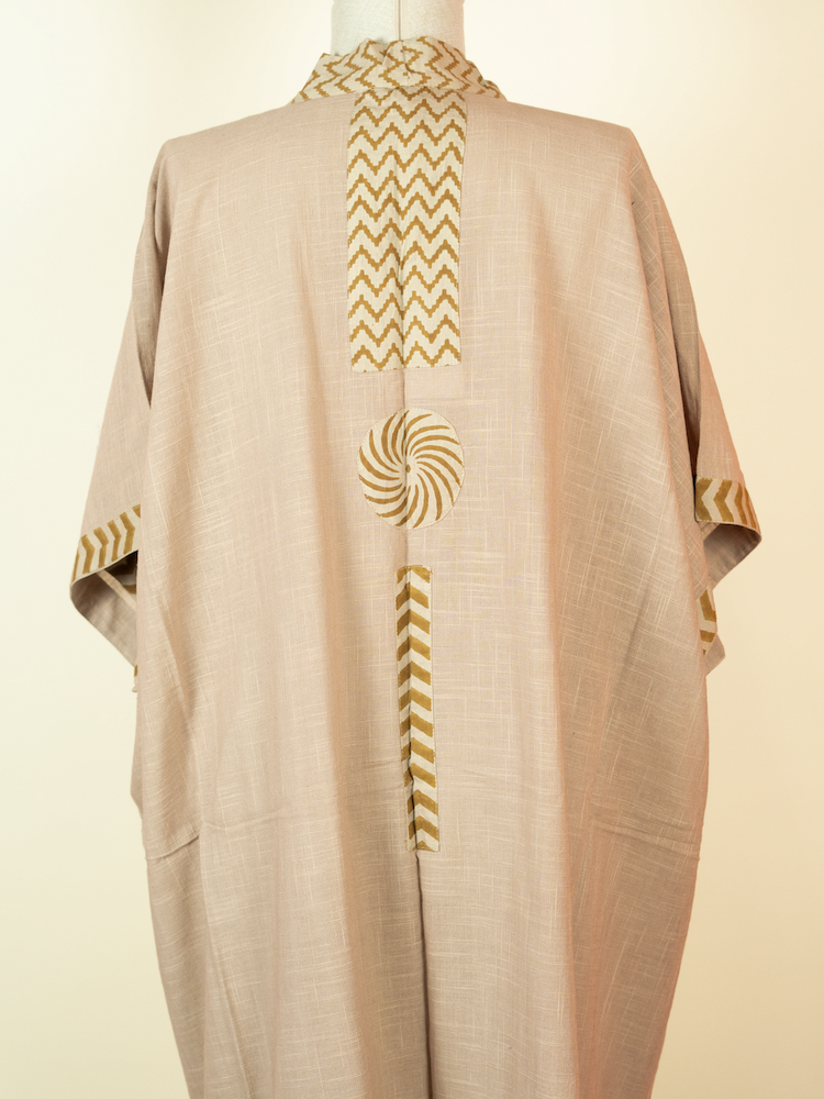 Long cotton kimono in Beige with block print details. Lightweight, relaxed, and designed for effortless layering.