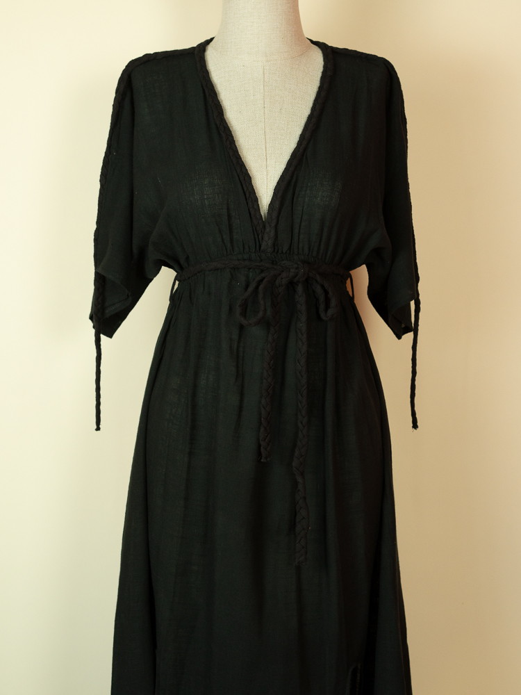 The deep V neckline and braided detailing add a subtle handcrafted feel, while the adjustable waist tie allows you to shape the fit to your body. The front slits bring movement and ease, making it perfect for walking along the beach or transitioning from day to evening.