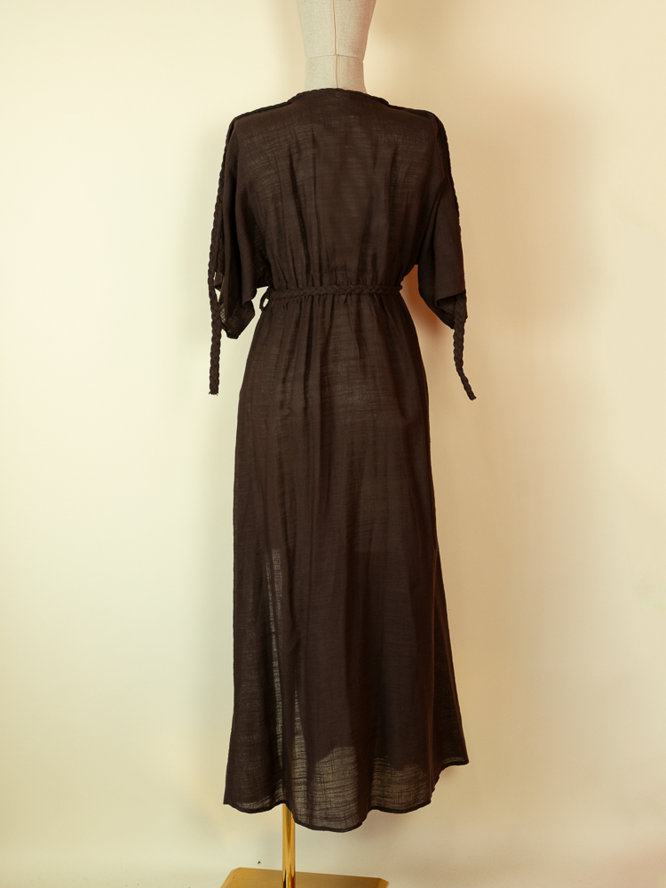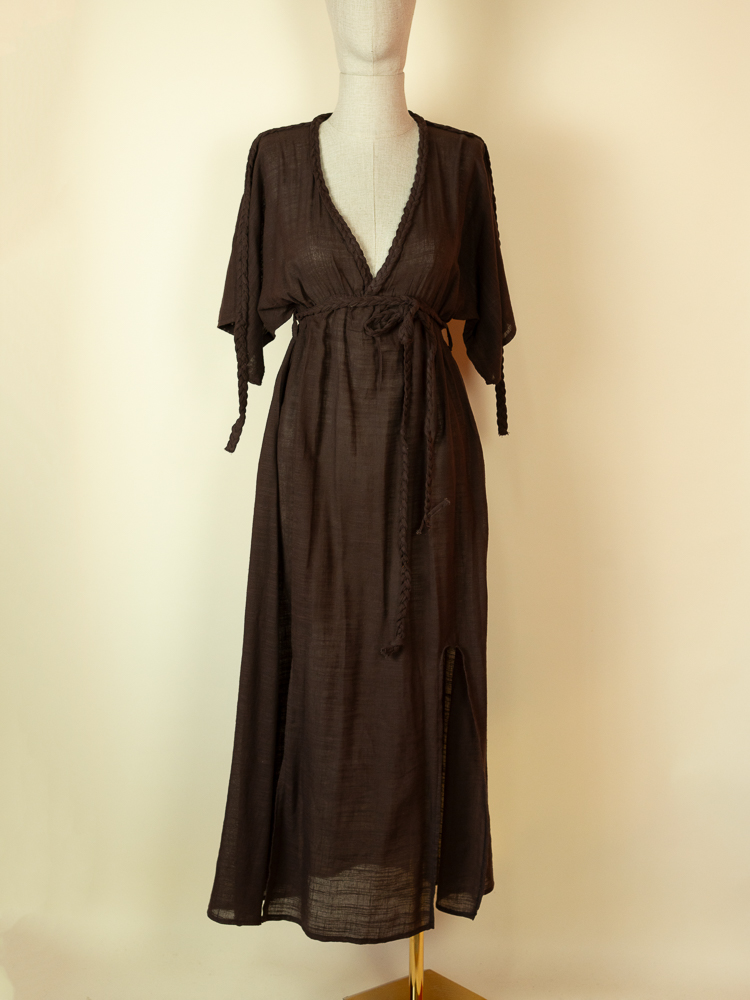 The deep V neckline and braided detailing add a subtle handcrafted feel, while the adjustable waist tie allows you to shape the fit to your body. The front slits bring movement and ease, making it perfect for walking along the beach or transitioning from day to evening.