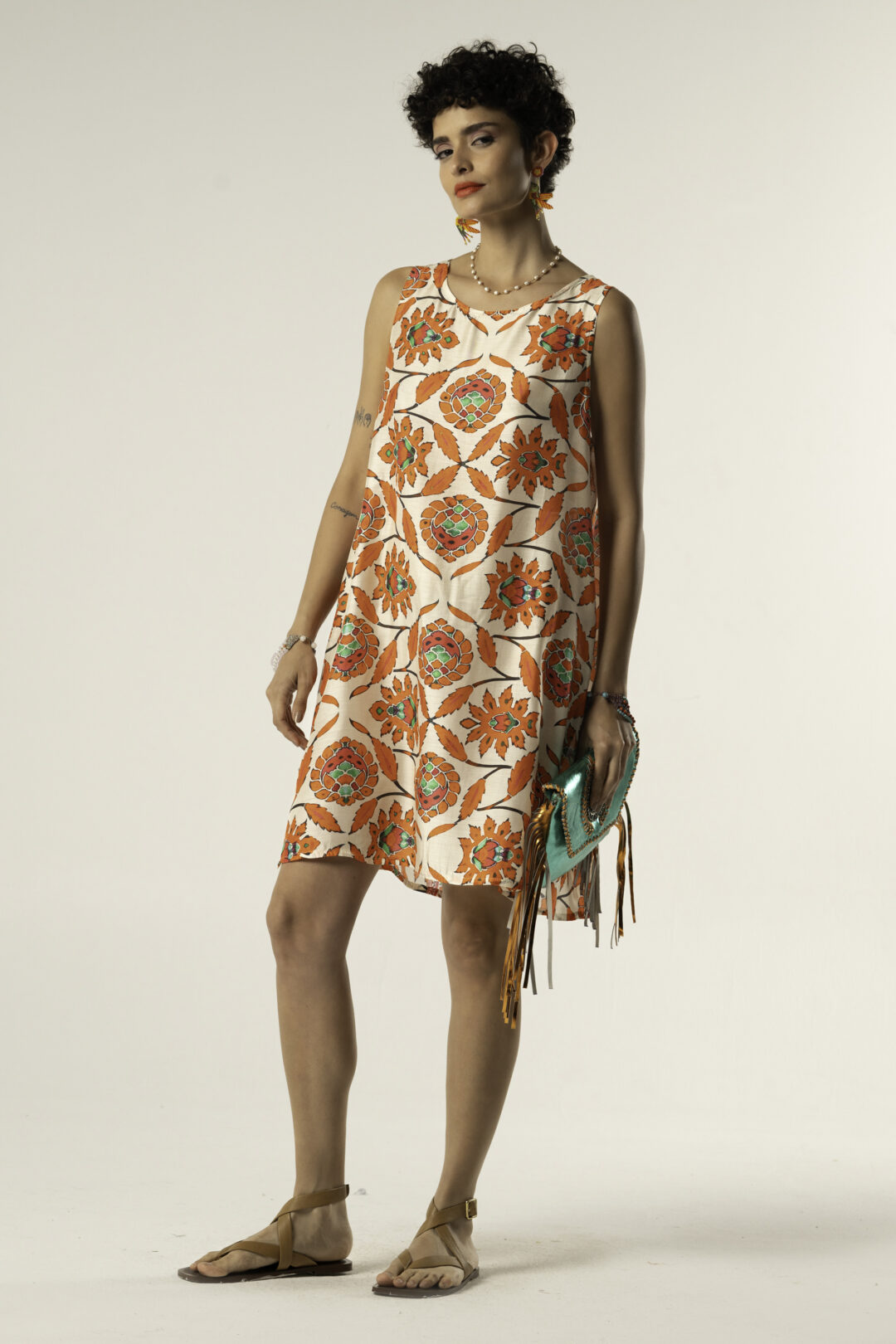 The Crop Dress in Mystique Orange print is a light cotton silk piece designed for easy summer days. Fresh, breathable, and soft on the skin, it offers comfort while keeping a refined, polished look.