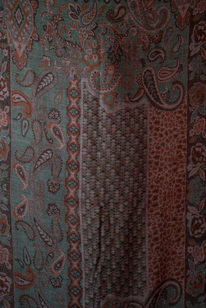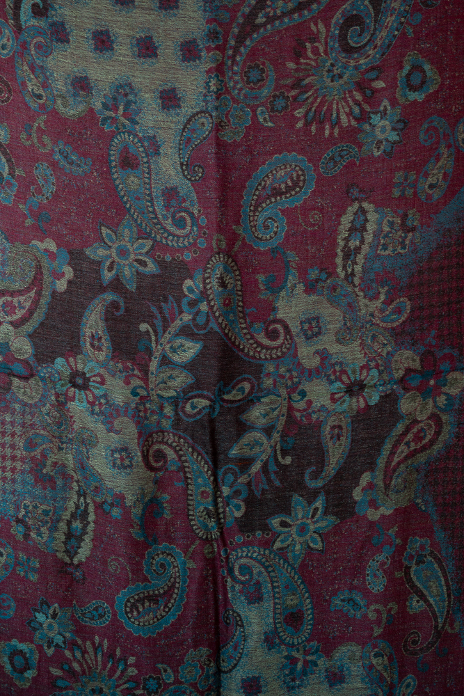 Discover timeless elegance with this luxurious double-sided wool shawl (90×220 cm), crafted in India from exceptionally soft wool. Rich burgundy, teal, and grey tones blend with traditional paisley patterns, creating a dramatic yet refined look.