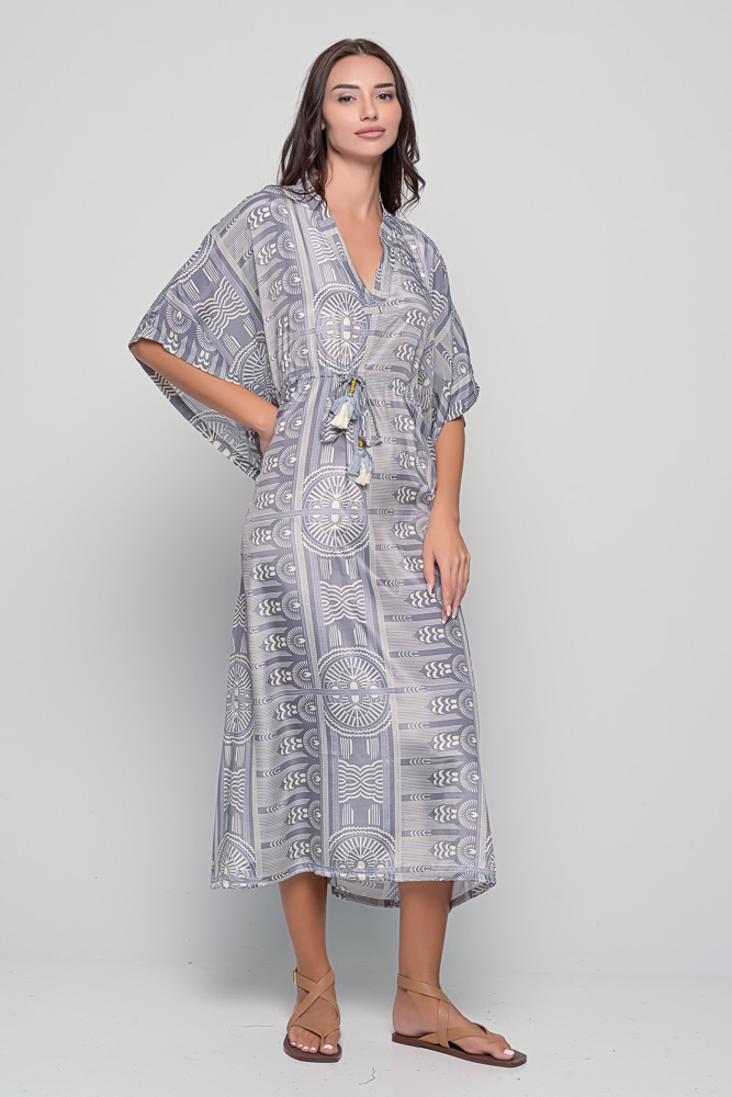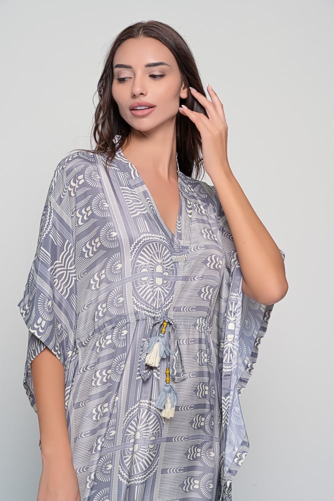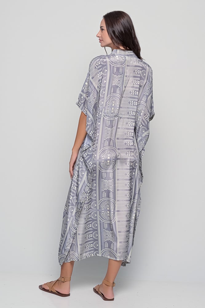 As a free-size piece, it drapes beautifully across body types, making it ideal for relaxed beach days, travel, or chic summer evenings. With its blend of artisanal print and luxurious silk, the Durga Caftan in grey is a versatile wardrobe statement.