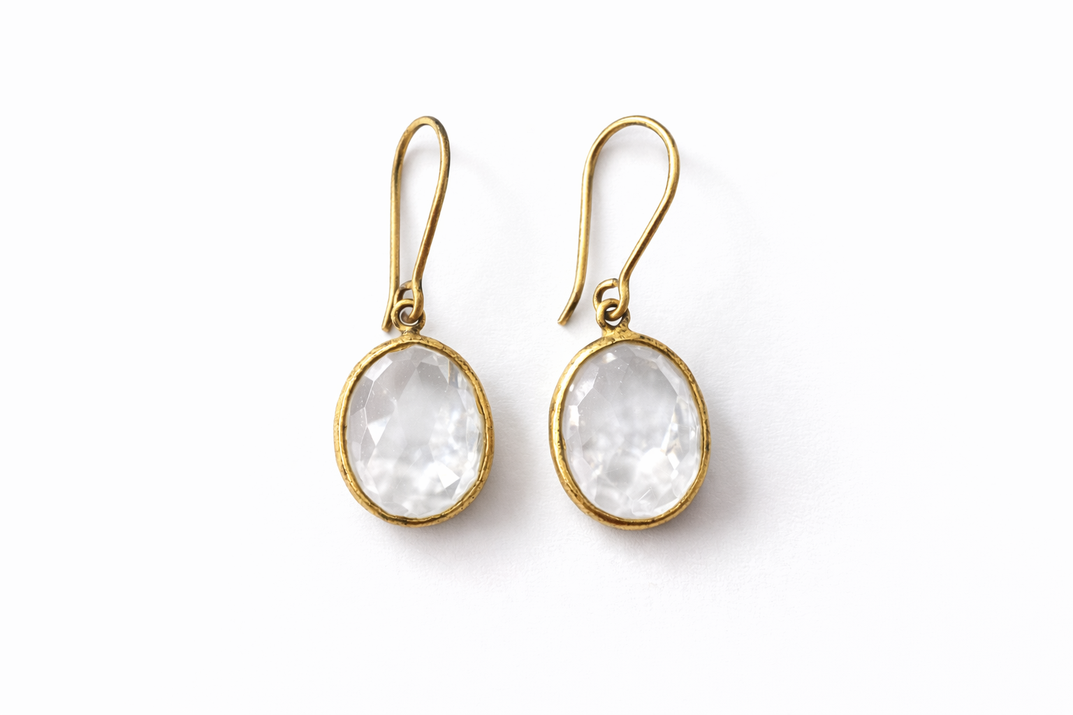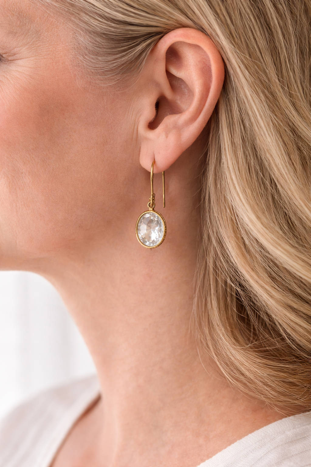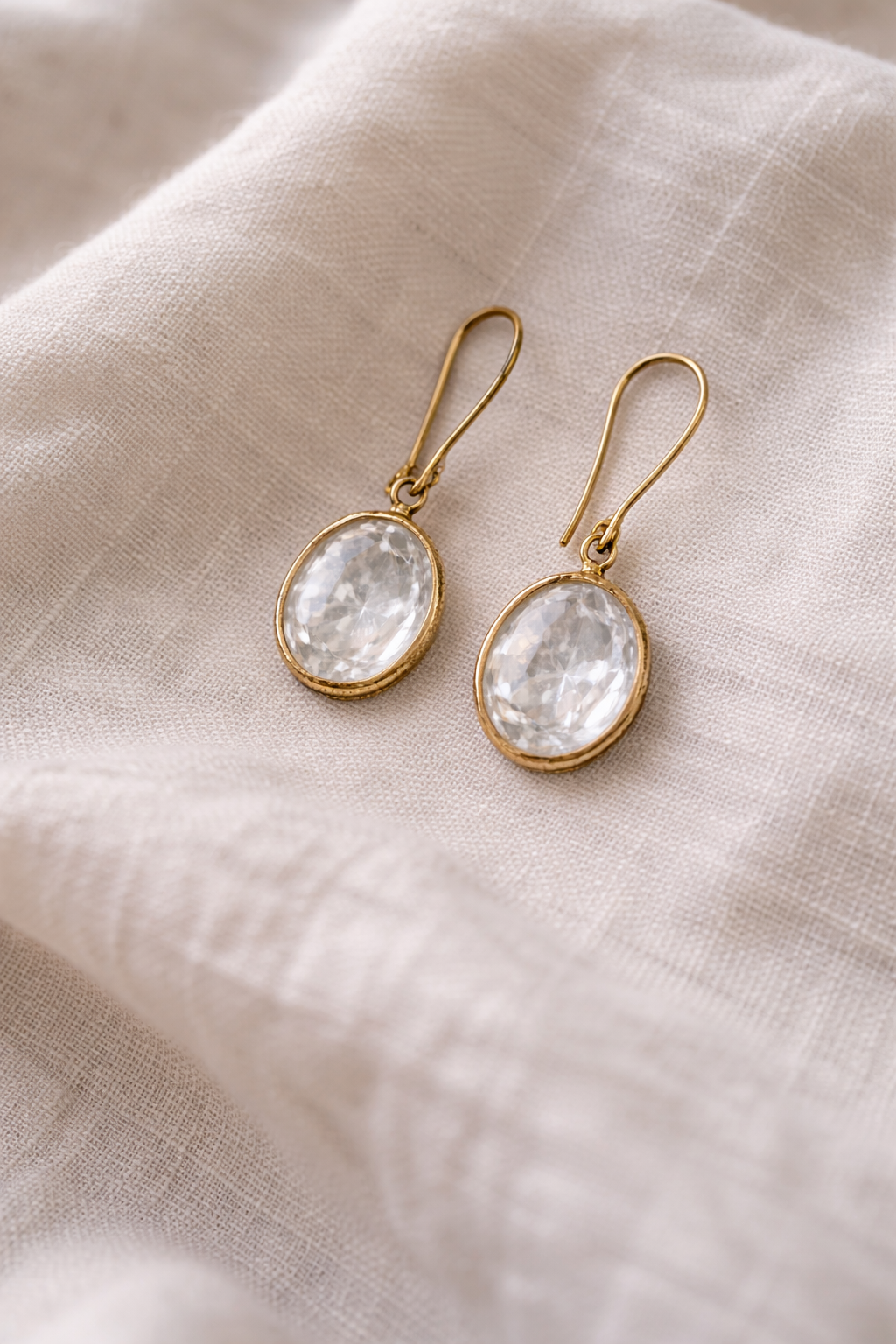 Elegant gold plated sterling silver earrings featuring faceted quartz stones that capture and reflect the light beautifully. Their refined oval shape and luminous transparency create a timeless piece that feels both minimal and sophisticated.