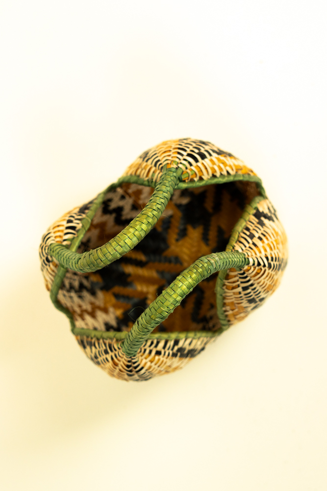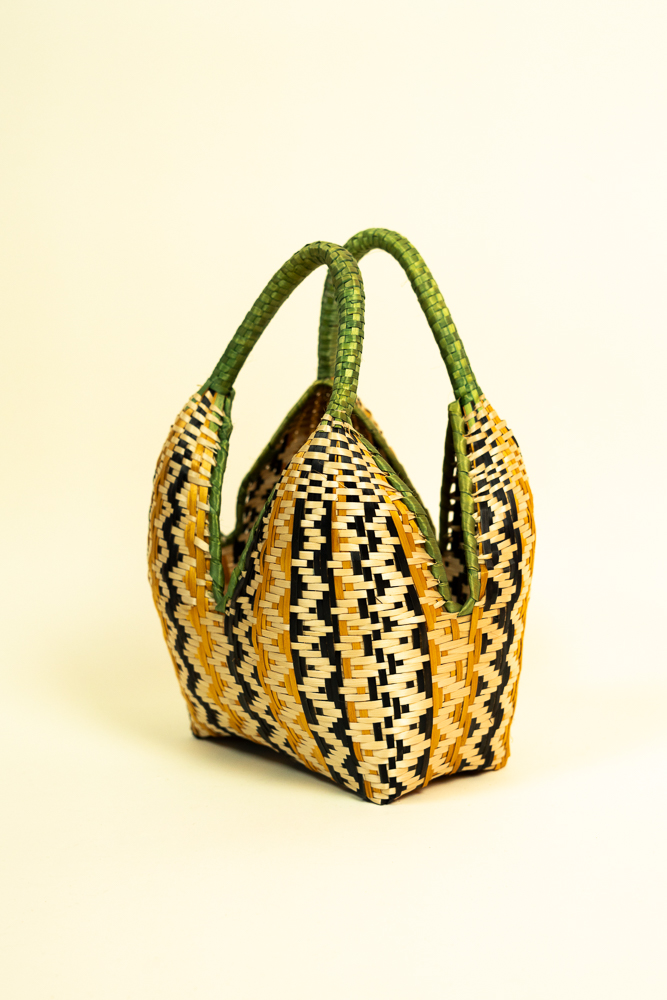 Named “Cuatro Tetas” for its distinctive four-point silhouette, this iconic design blends cultural heritage with everyday functionality. The zig-zag weave in earthy tones paired with vibrant green handles creates a striking yet versatile accessory perfect for daily wear.