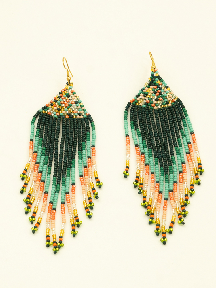 These handmade Colombian earrings are a celebration of color, rhythm and craftsmanship. Each pair is carefully created by artisans using a combination of glass beads and refined Miyuki beads, forming a precise yet expressive composition.