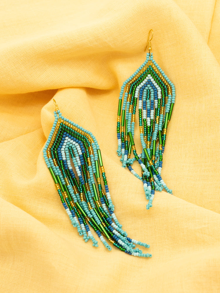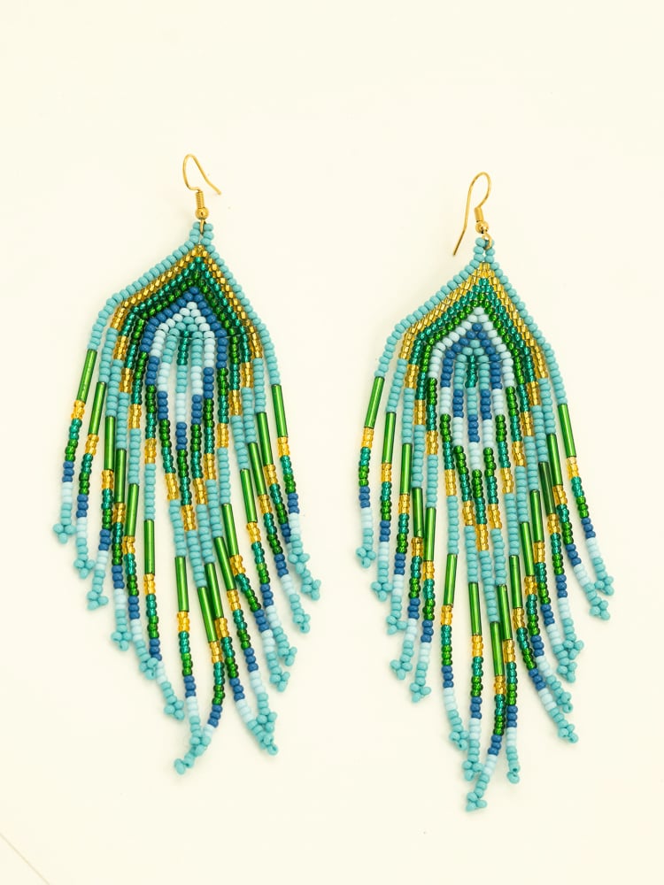 These handmade Colombian earrings are a celebration of color, rhythm and craftsmanship. Each pair is carefully created by artisans using a combination of glass beads and refined Miyuki beads, forming a precise yet expressive composition.