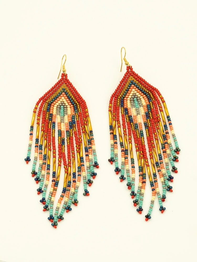 These handmade Colombian earrings are a celebration of color, rhythm and craftsmanship. Each pair is carefully created by artisans using a combination of glass beads and refined Miyuki beads, forming a precise yet expressive composition.