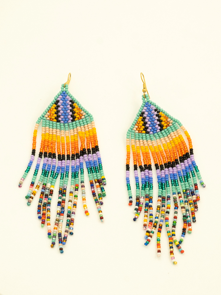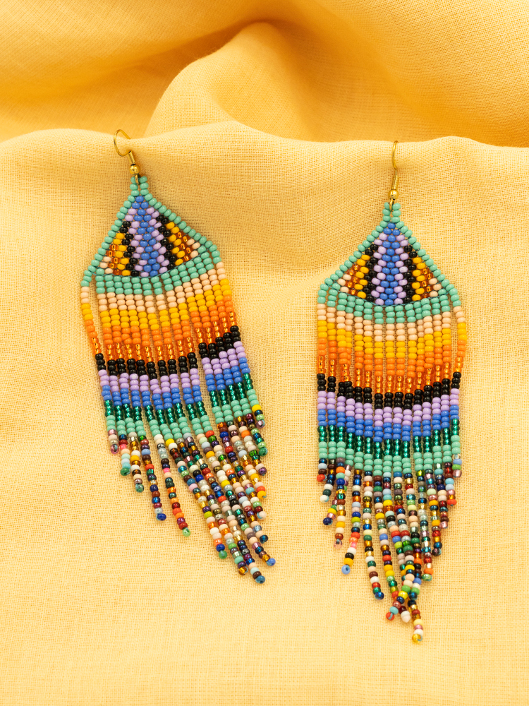 These handmade Colombian earrings are a celebration of color, rhythm and craftsmanship. Each pair is carefully created by artisans using a combination of glass beads and refined Miyuki beads, forming a precise yet expressive composition.