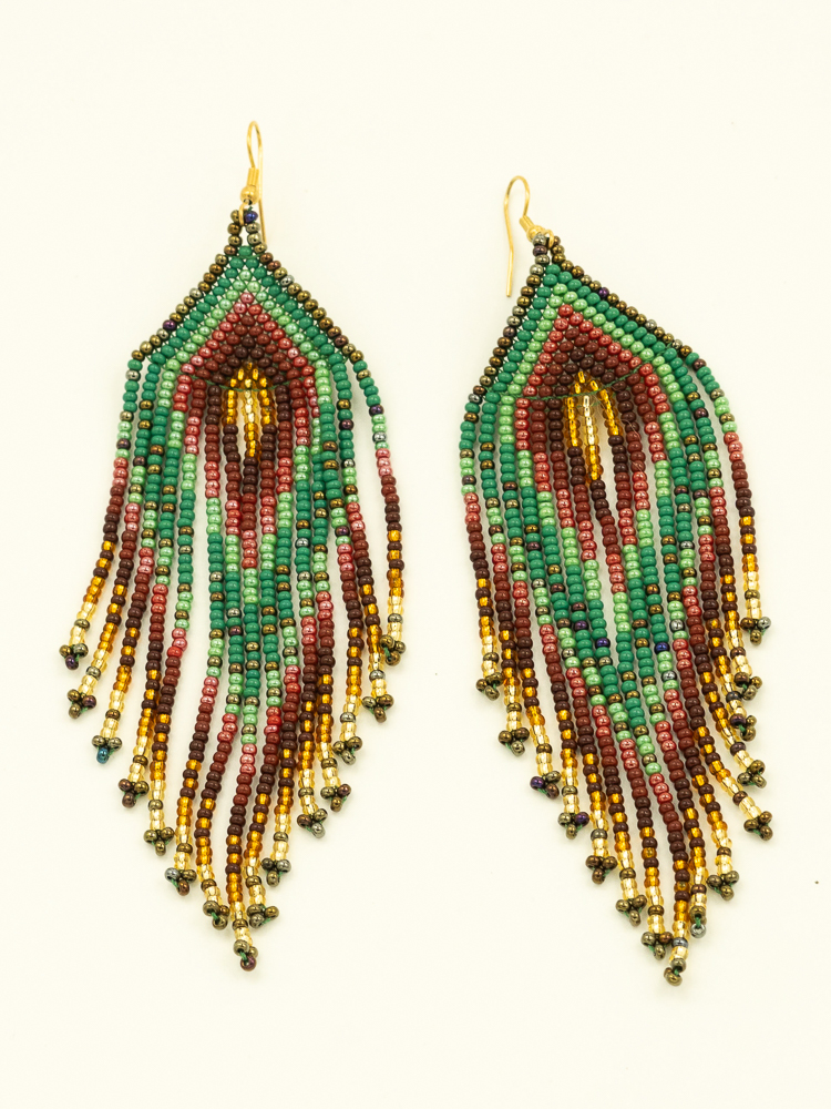 These handmade Colombian earrings are a celebration of color, rhythm and craftsmanship. Each pair is carefully created by artisans using a combination of glass beads and refined Miyuki beads, forming a precise yet expressive composition.
