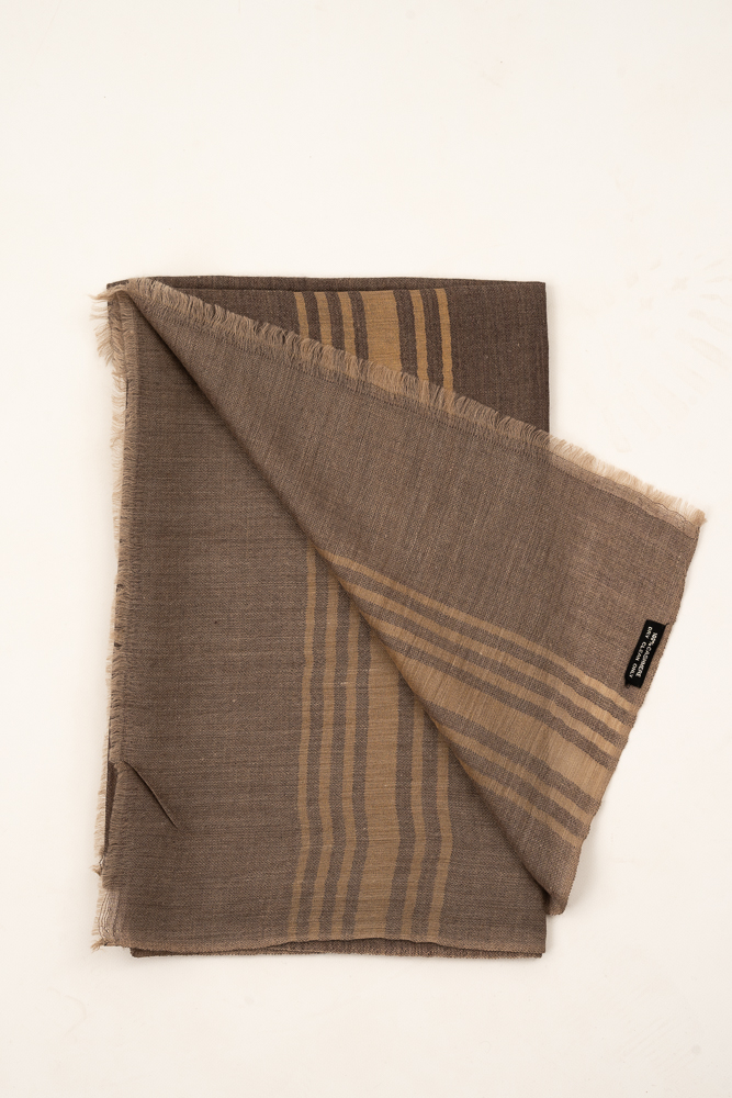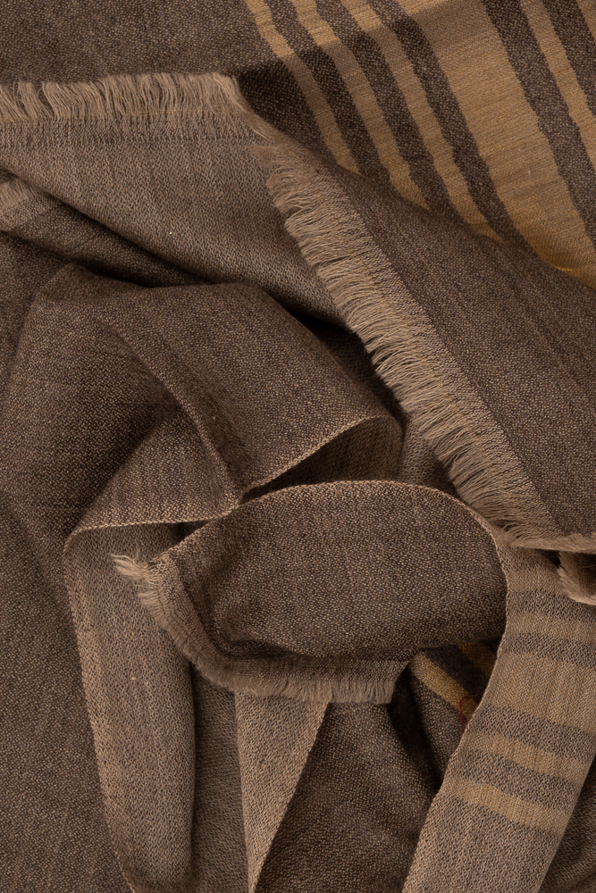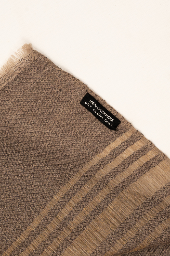Elevate your wardrobe with this handwoven cashmere pashmina shawl in a refined brown and beige striped design. Expertly crafted by Himalayan artisans, this luxurious wrap offers unmatched softness, warmth, and breathability thanks to its 100% pure cashmere composition.