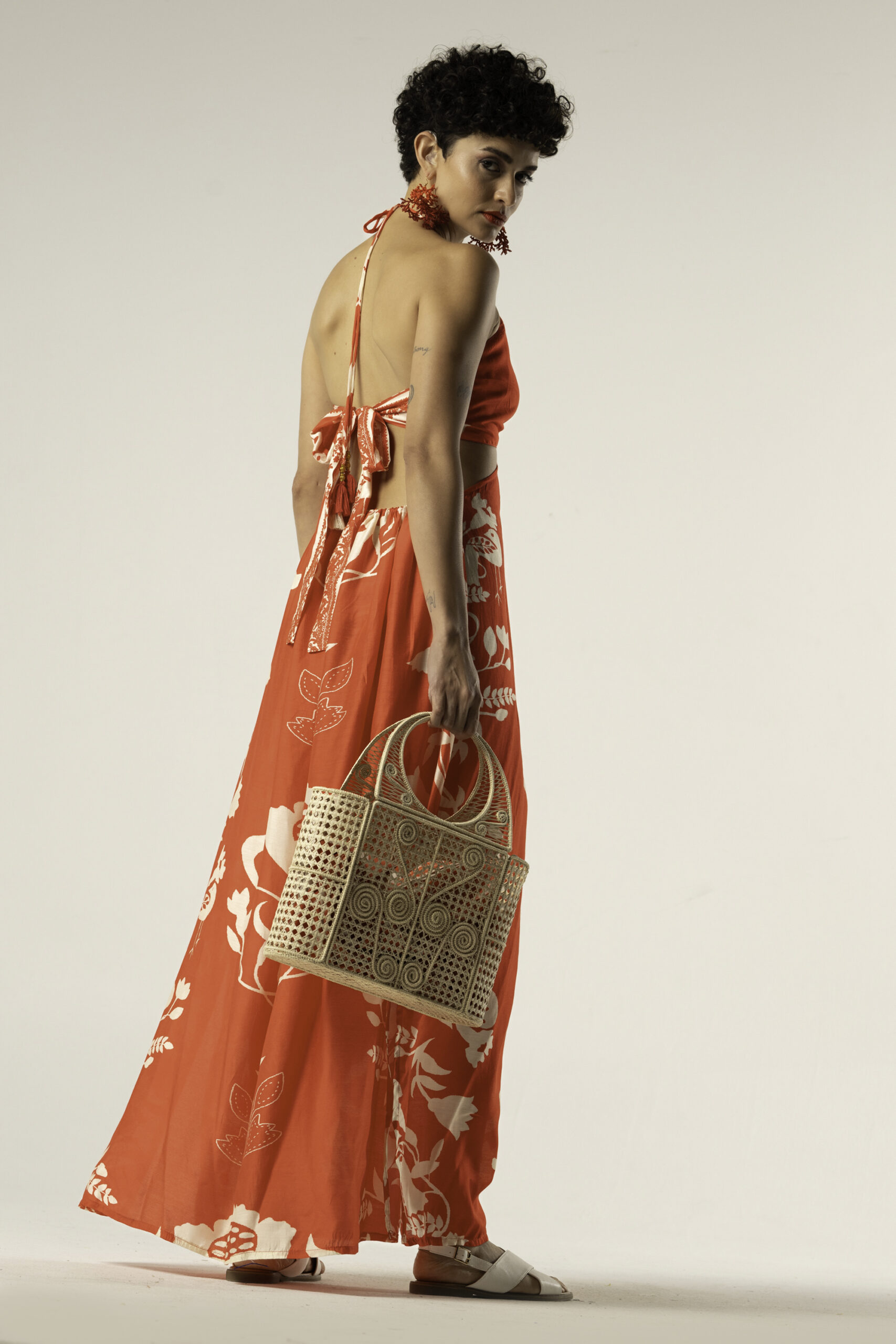 The halter neckline creates an open, flattering shape, while the softly gathered waist adds definition without restricting comfort. The long silhouette elongates the body and enhances the fluid drape of the cotton silk fabric.