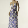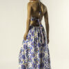 The halter neckline creates an open, flattering shape, while the softly gathered waist adds definition without restricting comfort. The long silhouette elongates the body and enhances the fluid drape of the cotton silk fabric.