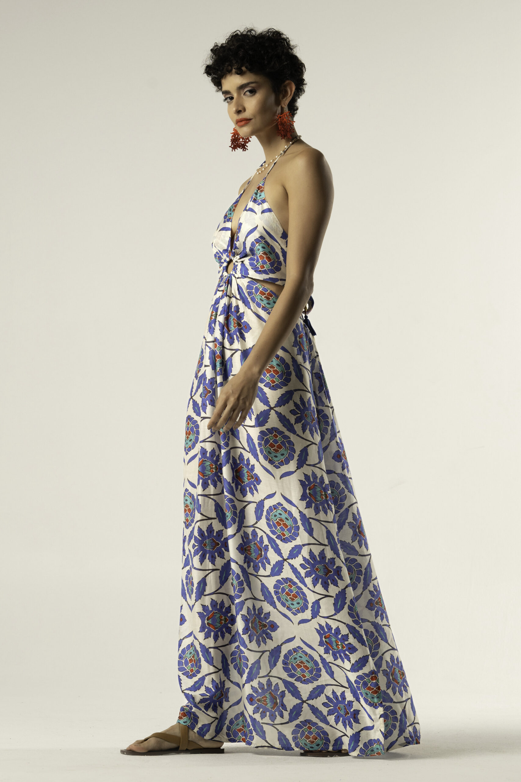 The halter neckline creates an open, flattering shape, while the softly gathered waist adds definition without restricting comfort. The long silhouette elongates the body and enhances the fluid drape of the cotton silk fabric.