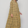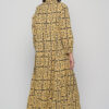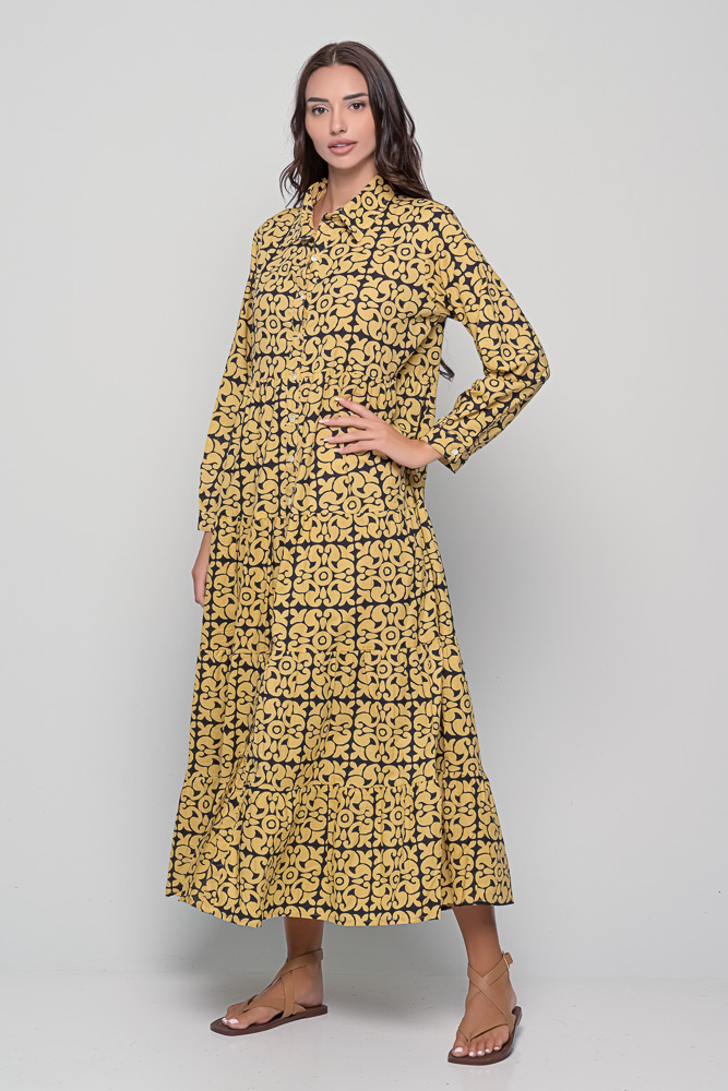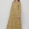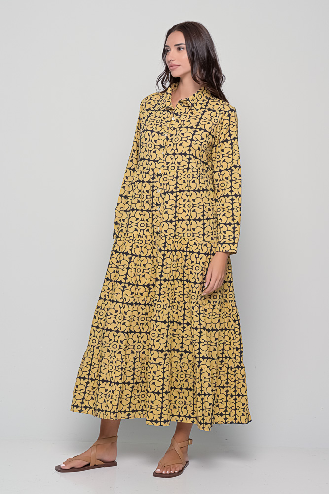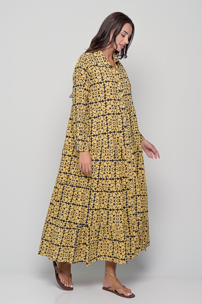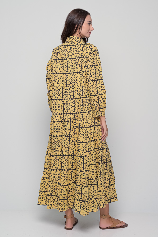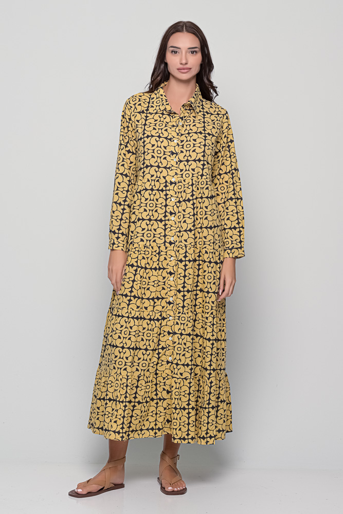 The Ikaria Dress in cotton with black tile print. A free-size maxi dress with long sleeves, buttoned front, and relaxed bohemian style.