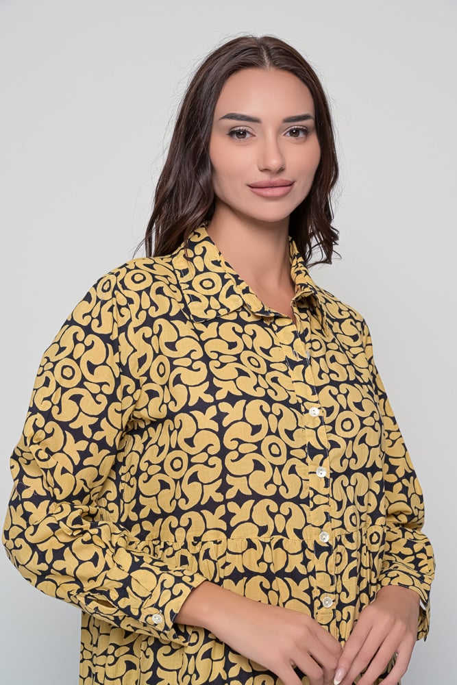 • The Ikaria Dress is a relaxed, versatile maxi dress crafted from breathable cotton. Designed in the unique black tile print, it combines timeless bohemian charm with everyday comfort. With its free-size cut, button-down front, and long sleeves, the Ikaria Dress is easy to style for multiple occasions — from laid-back daywear to travel and evening gatherings.
